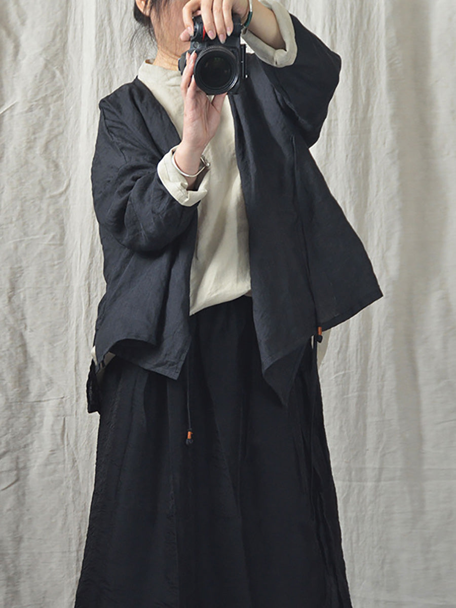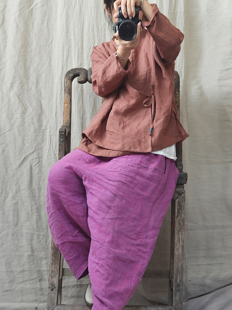 بلوزة نسائية من الكتان بتصميم عتيق بفتحة رقبة على شكل حرف V وحزام للخصر