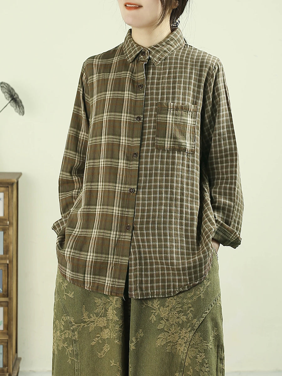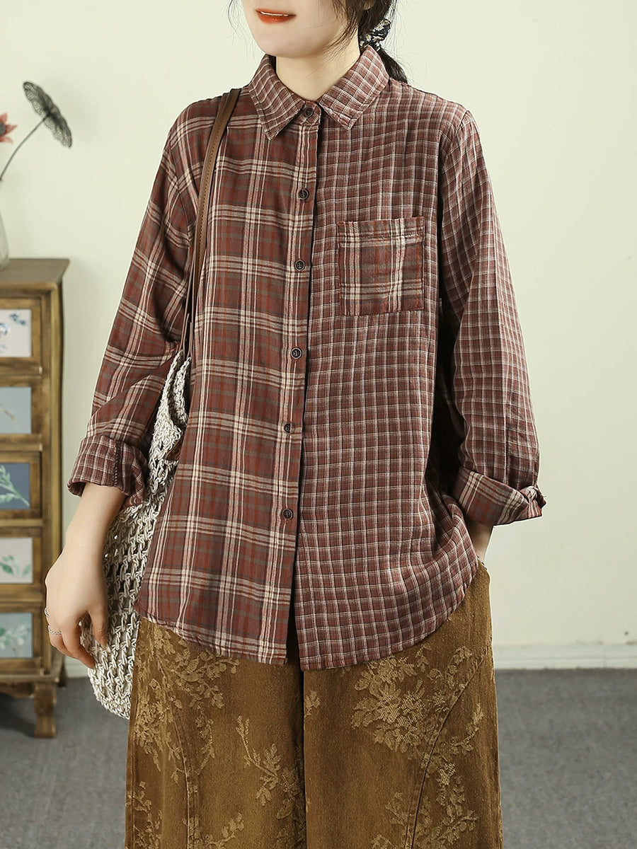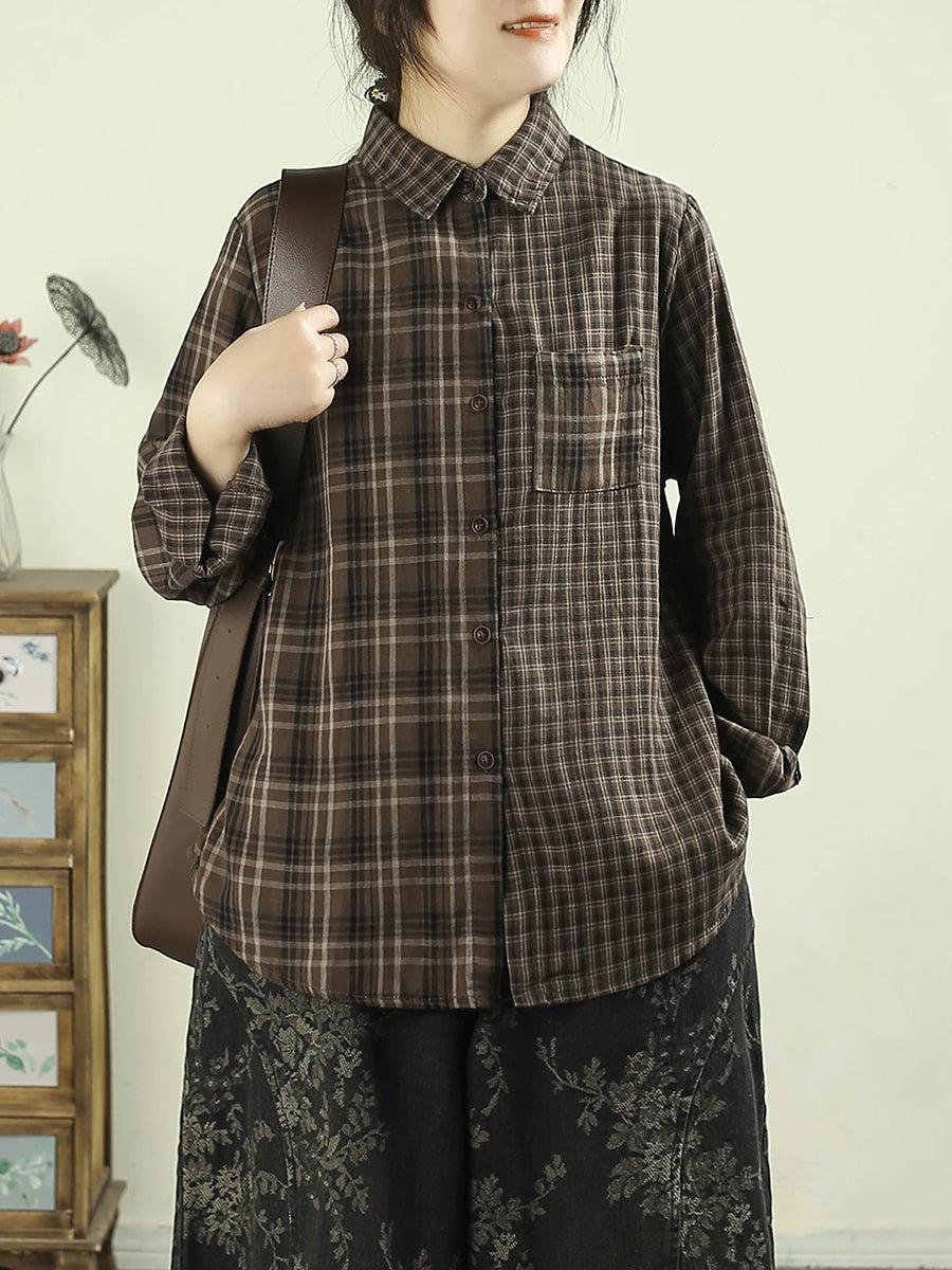 قميص نسائي ربيعي كلاسيكي بنقشة مربعات وياقة مطوية، مصنوع من القطن بنسبة 100%