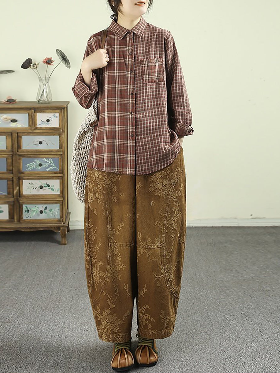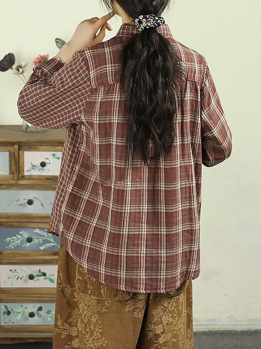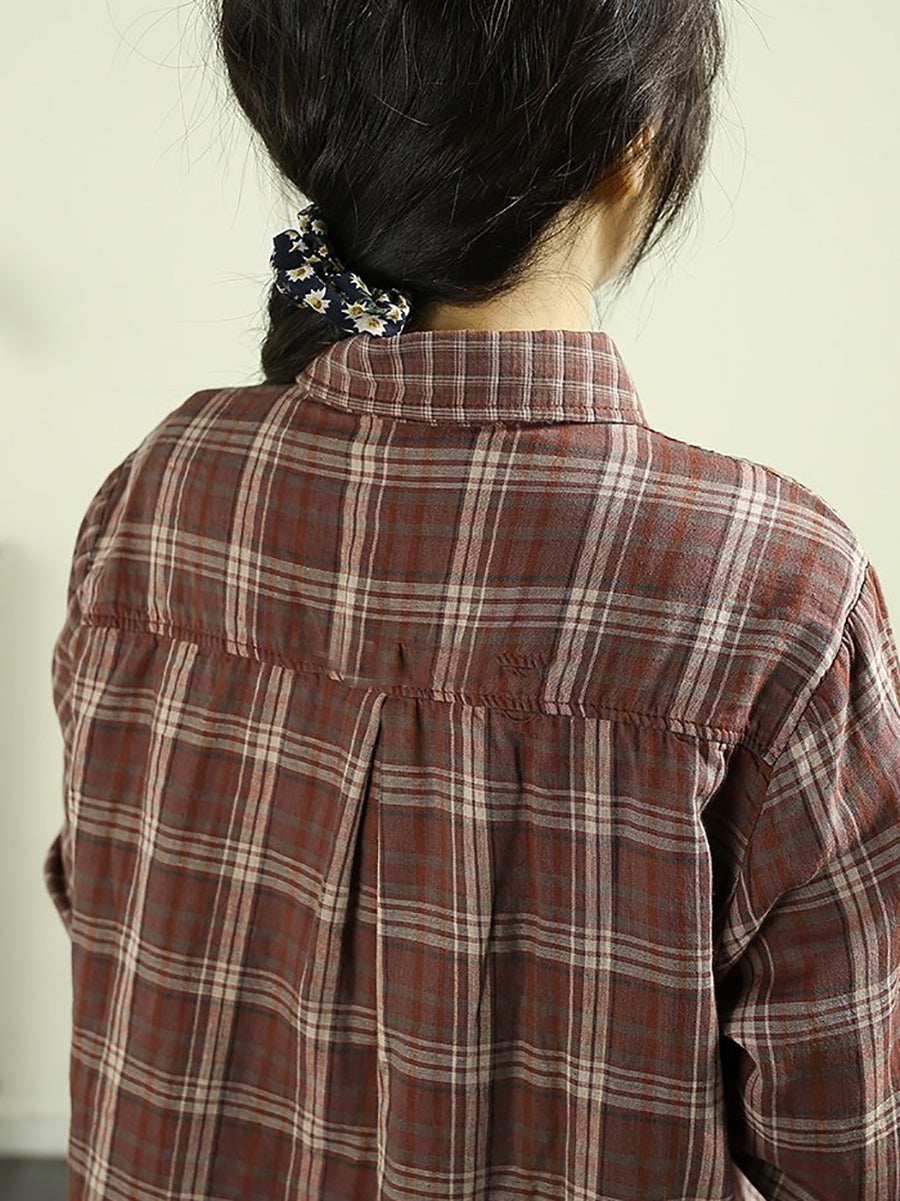 قميص نسائي ربيعي كلاسيكي بنقشة مربعات وياقة مطوية، مصنوع من القطن بنسبة 100%