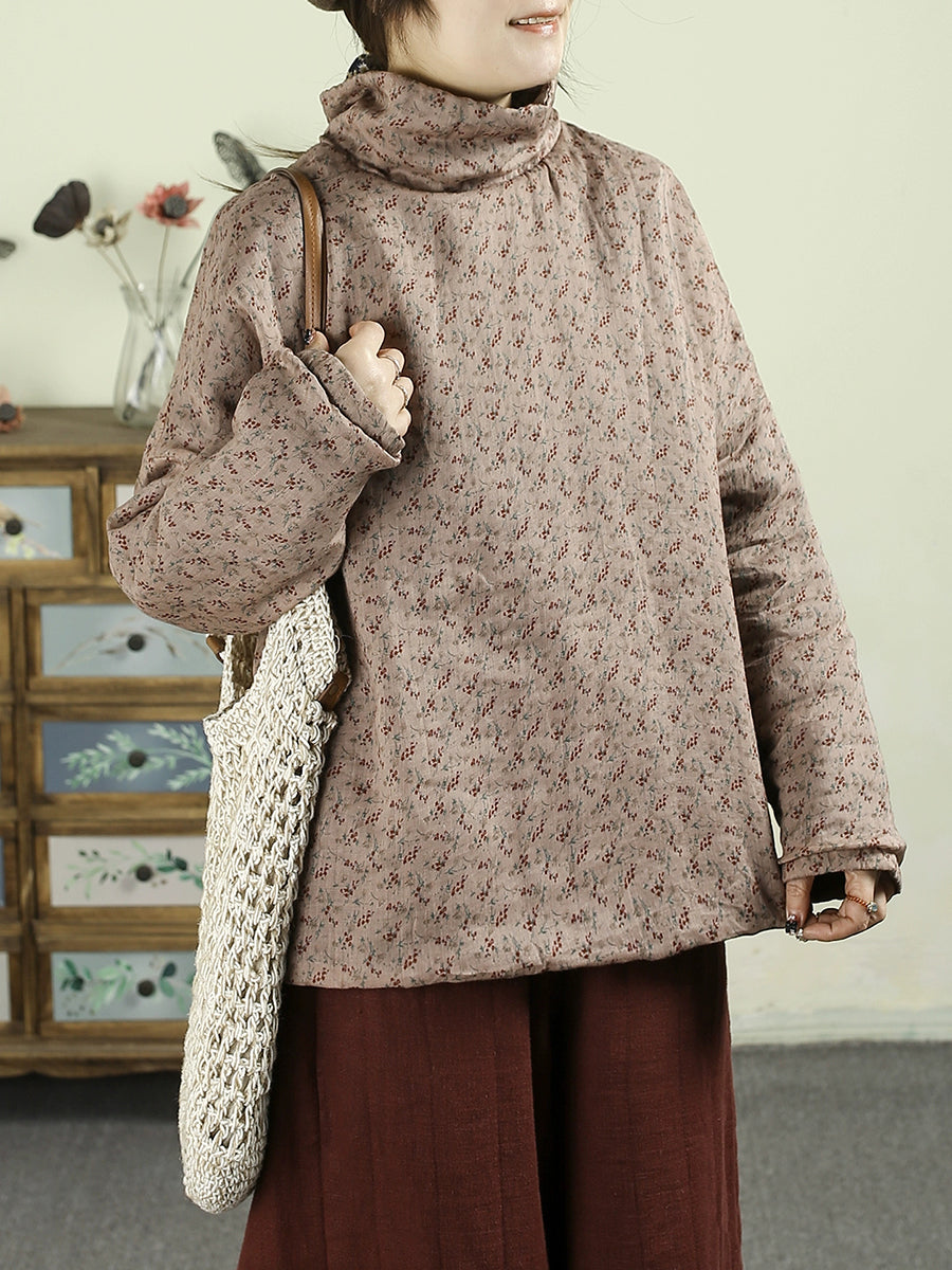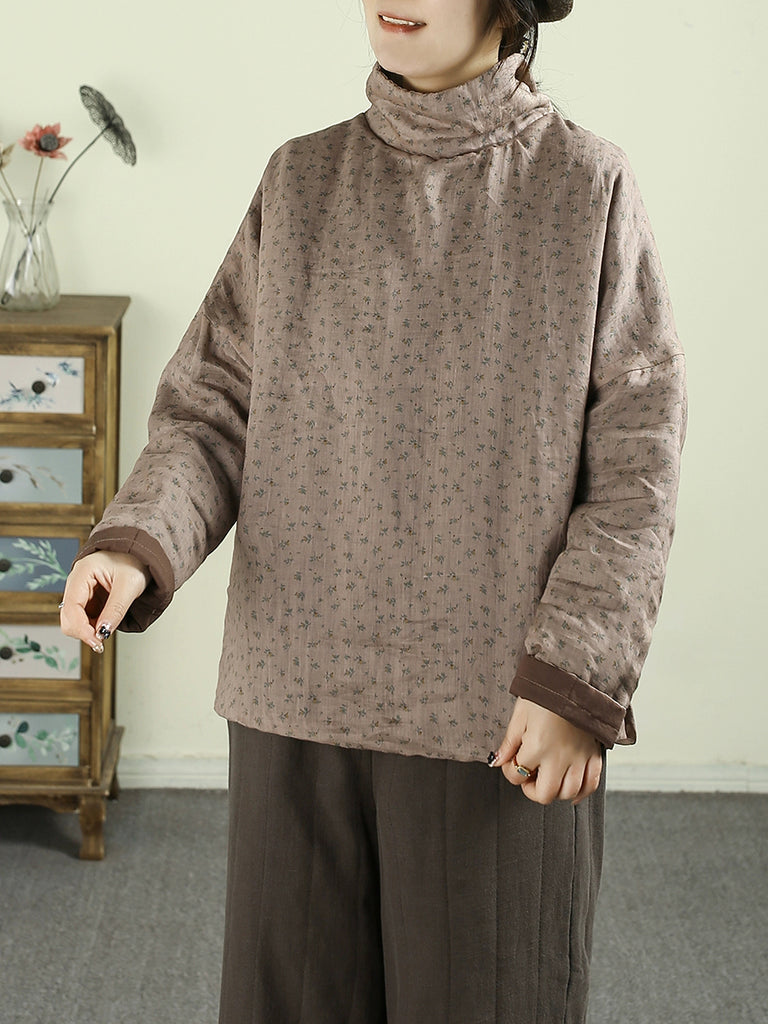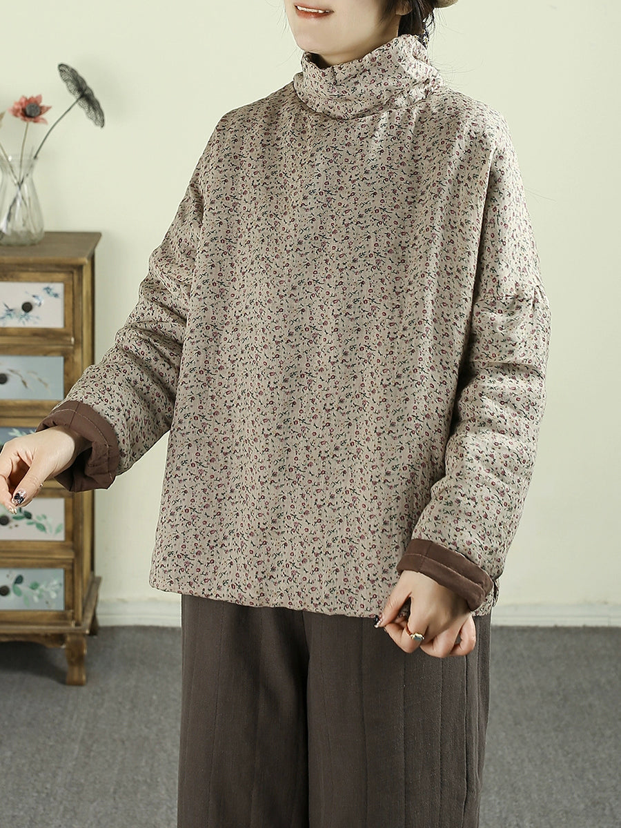 معطف نسائي شتوي من قماش الرامي المبطن ذو الياقة العالية والمزين بنقشة الأزهار العرقية