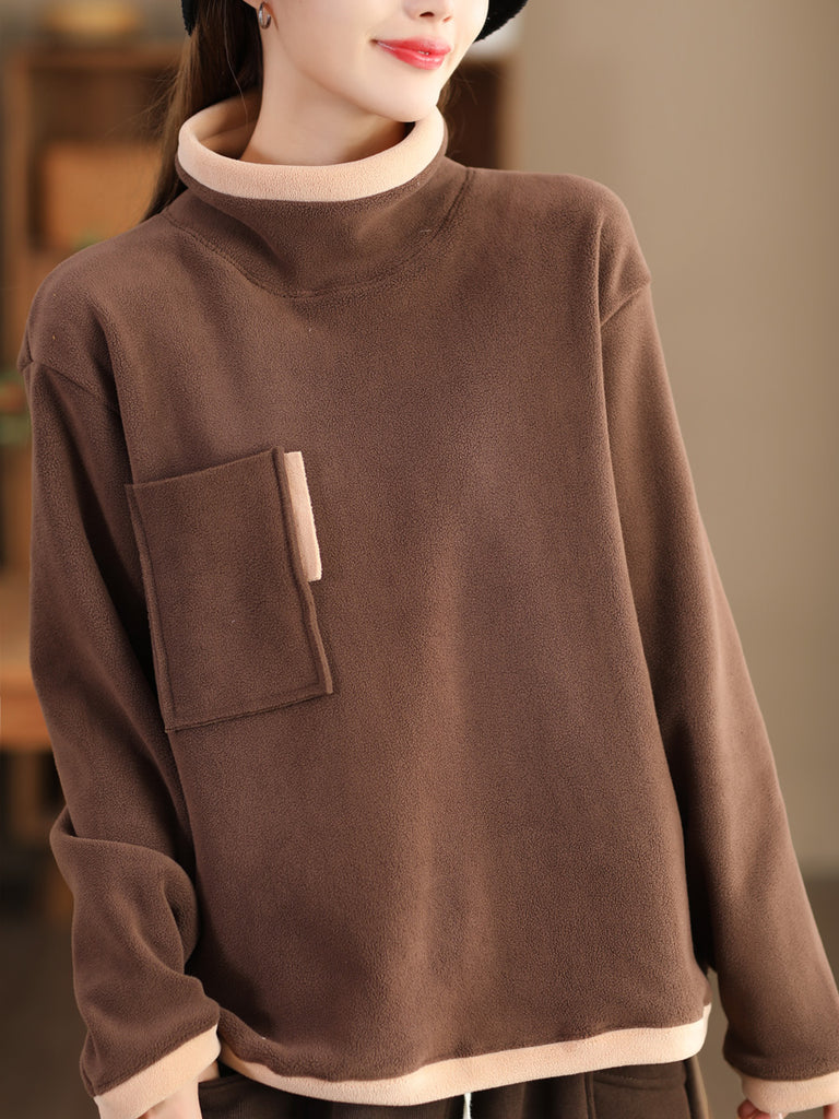 Women Casual Winter Spliced Turtleneck Fleece Sweatshirt