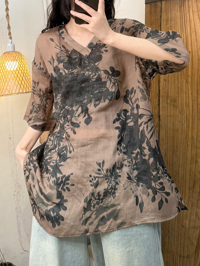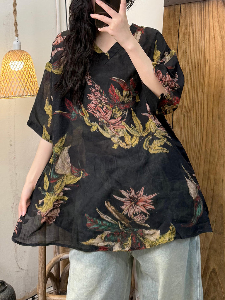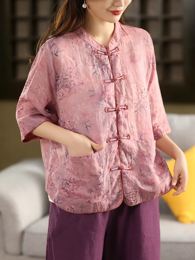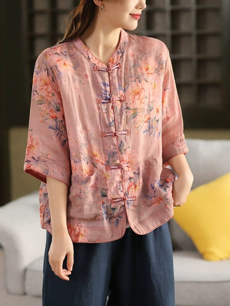 Women Summer Retro Embroidery O-Neck 100%Ramie Shirt