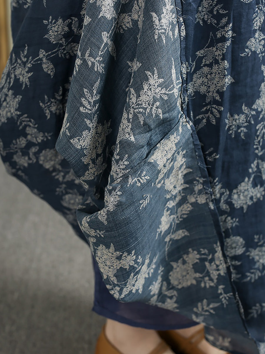Plus Size Women Summer Vintage Flower V-Neck 100%Ramie Dress