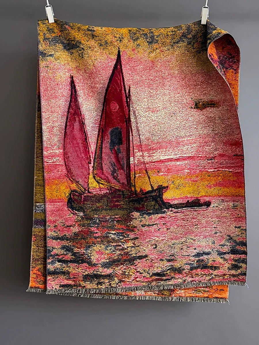 Vintage Winter Oil Painting Sailing Boat Shawl Scarf