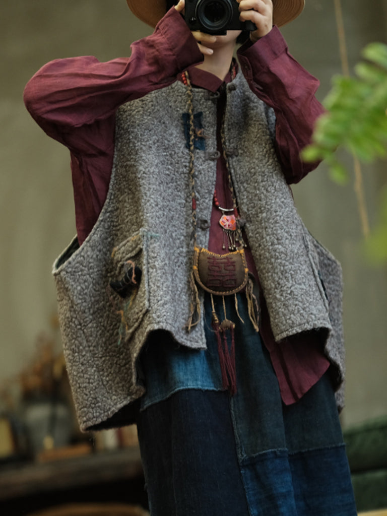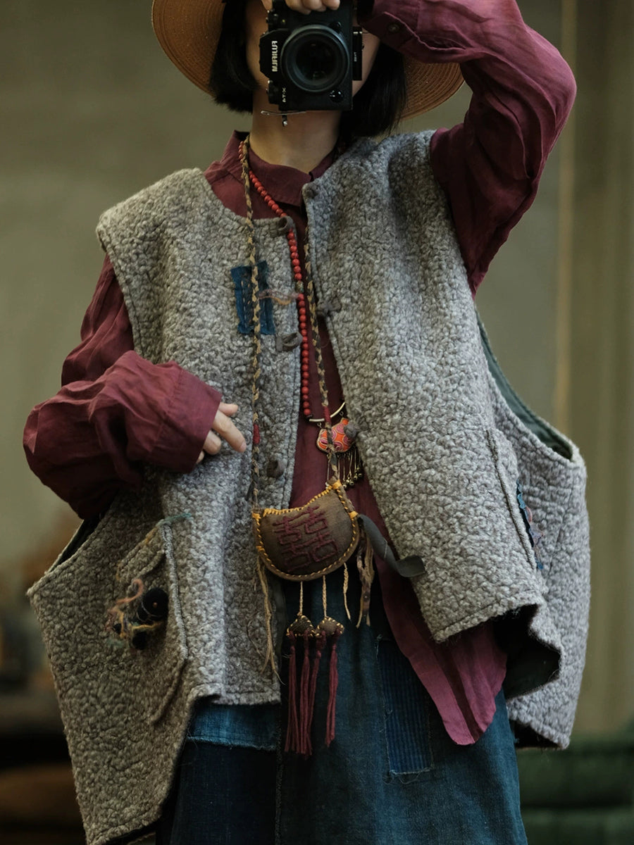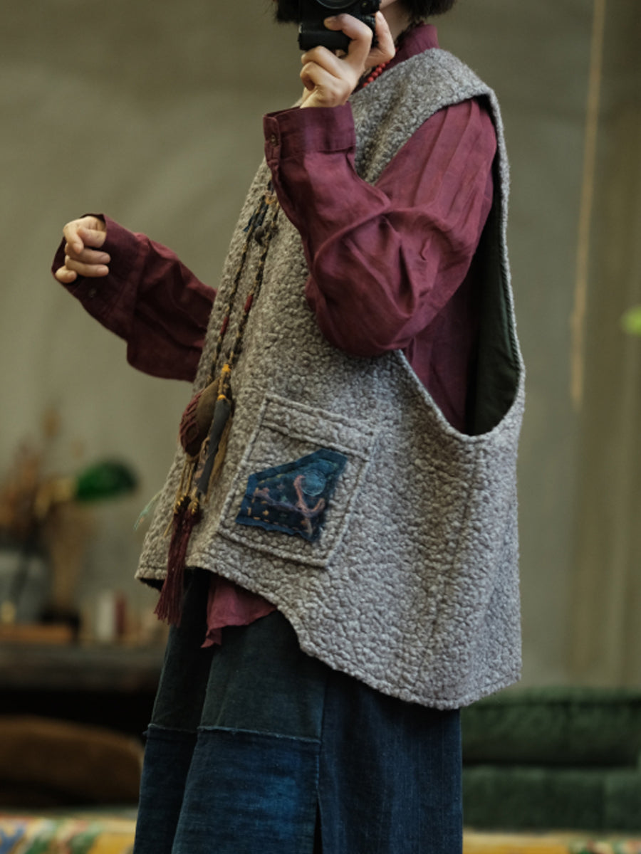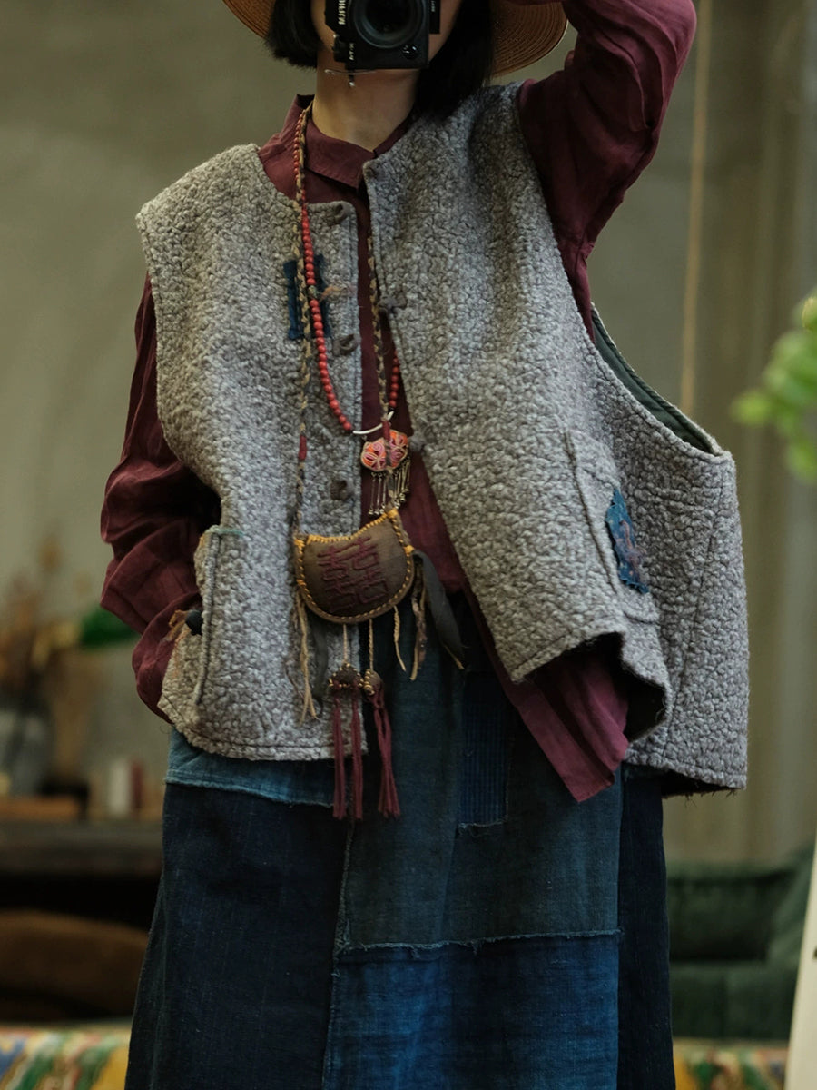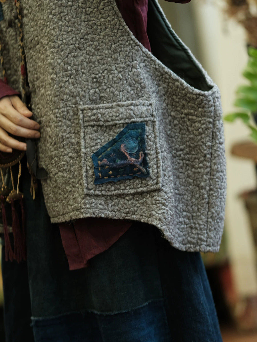 Women Winter Vintage Patch Fleece O-Neck Vest