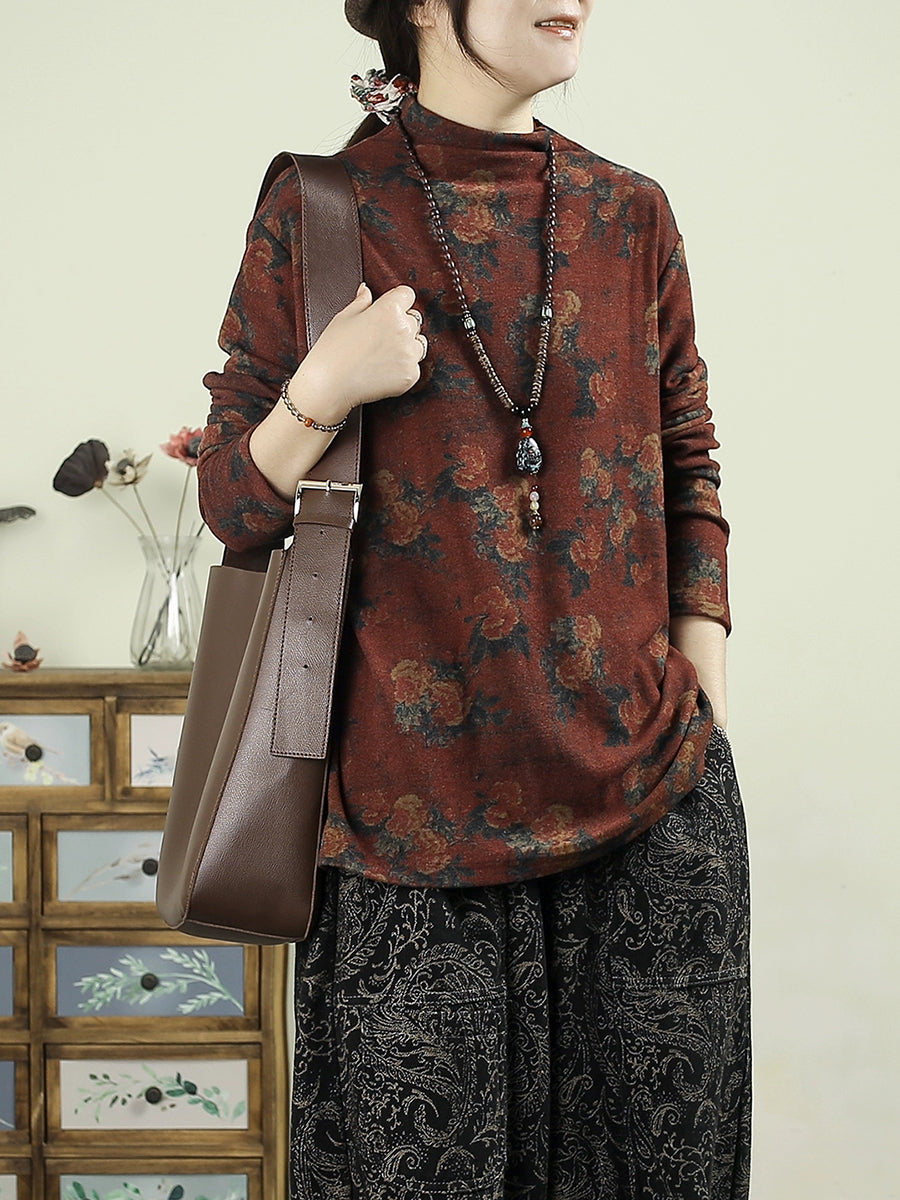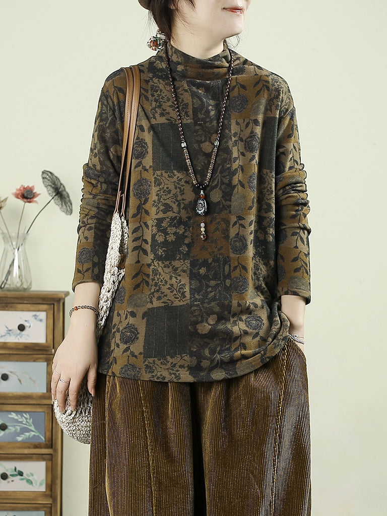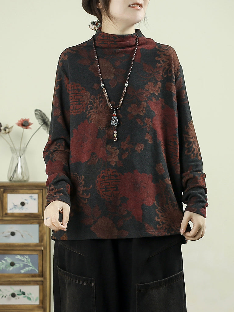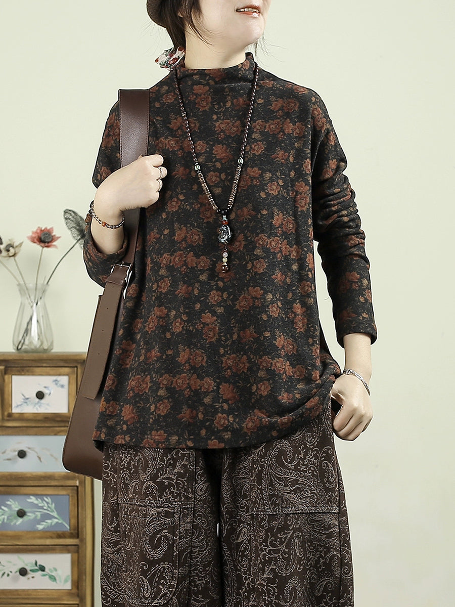 Women Vintage Autumn Flower Half-Turtleneck Blouse
