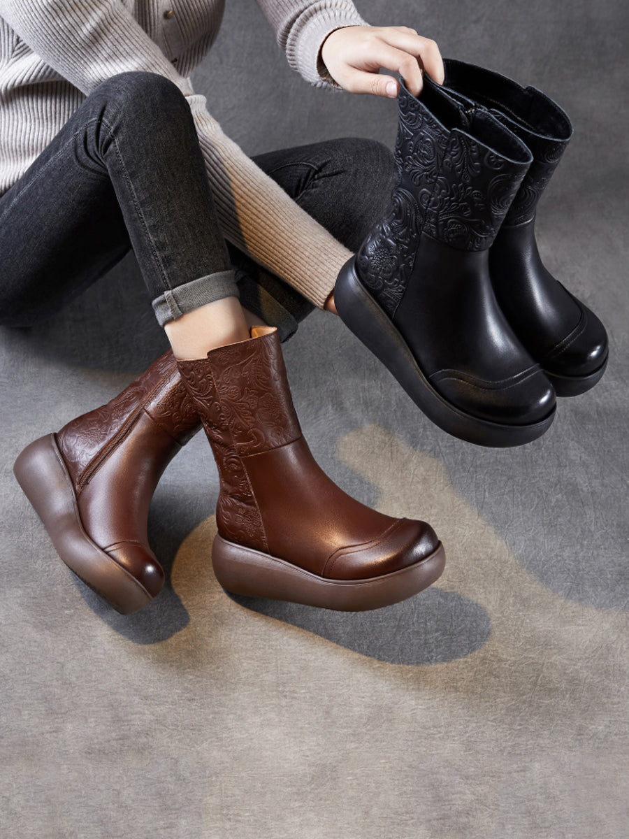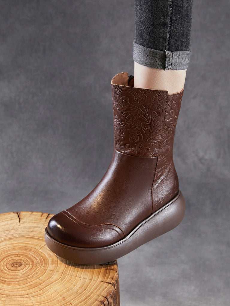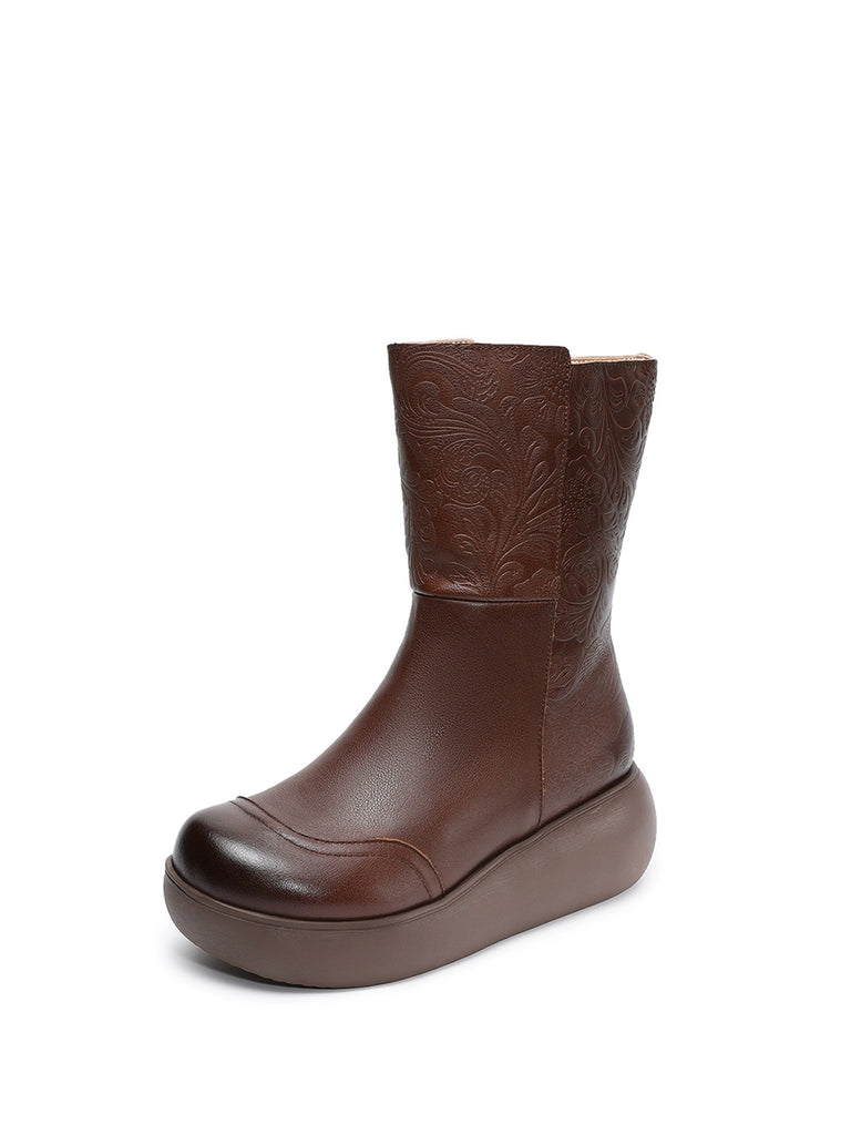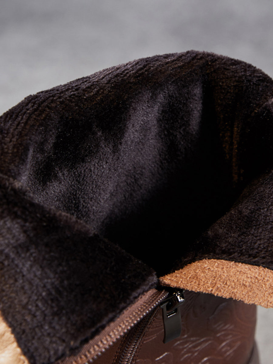 Women Vintage Leather Embossing Fleece-lined Boots