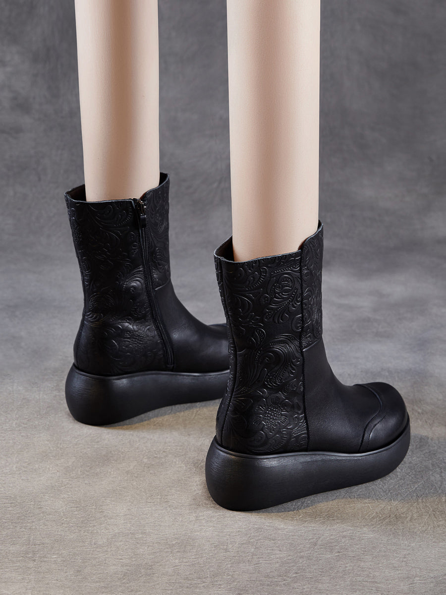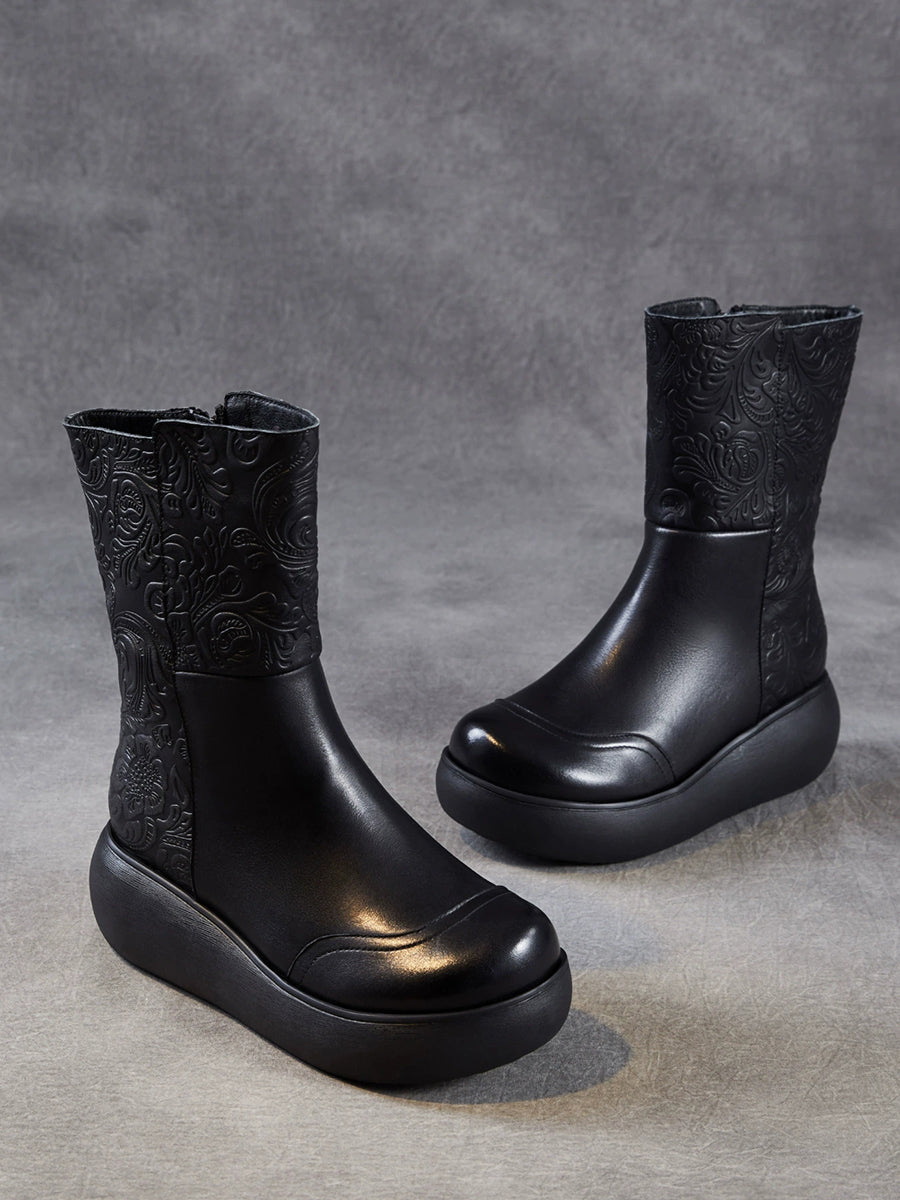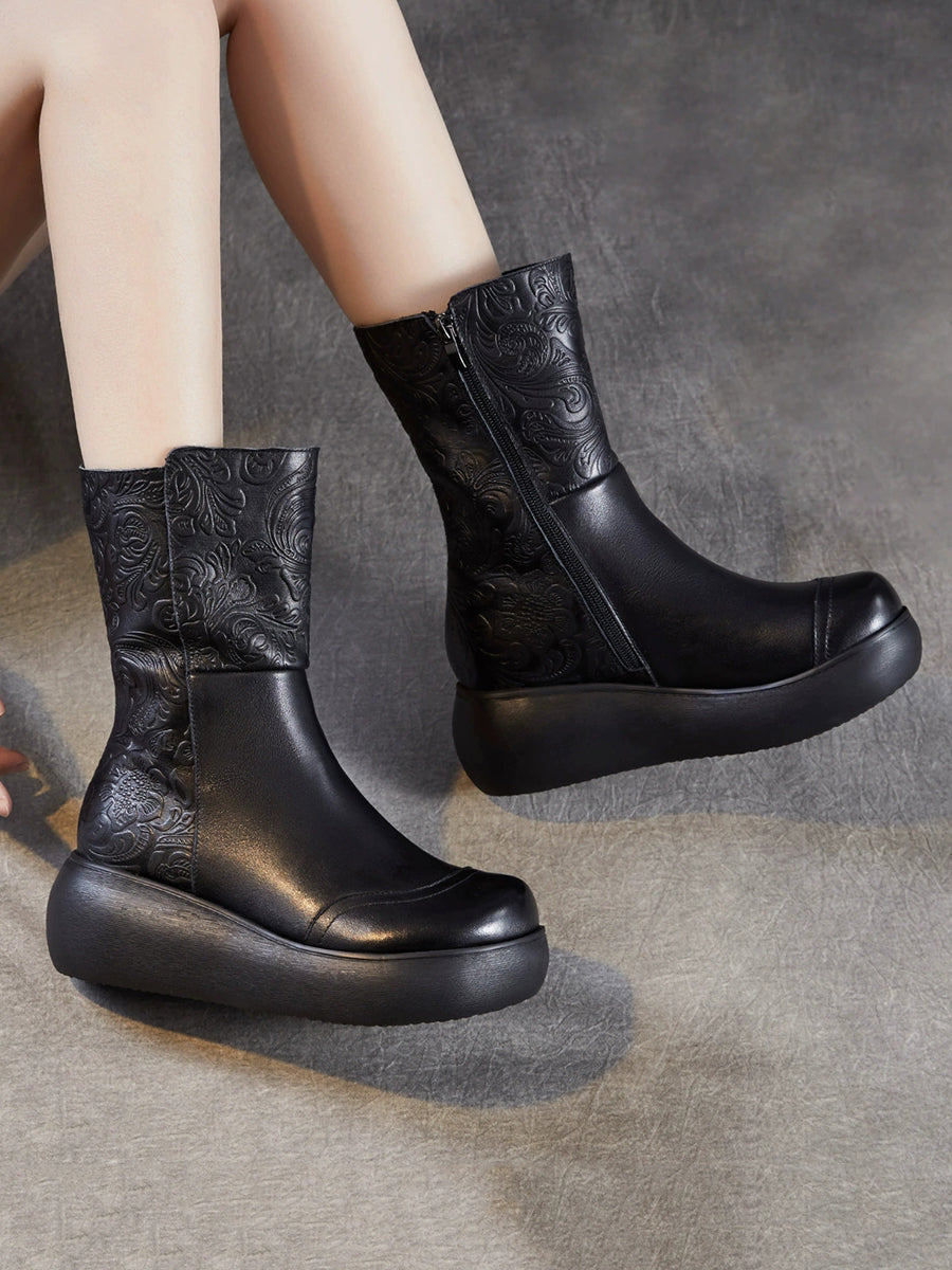 Women Vintage Leather Embossing Fleece-lined Boots