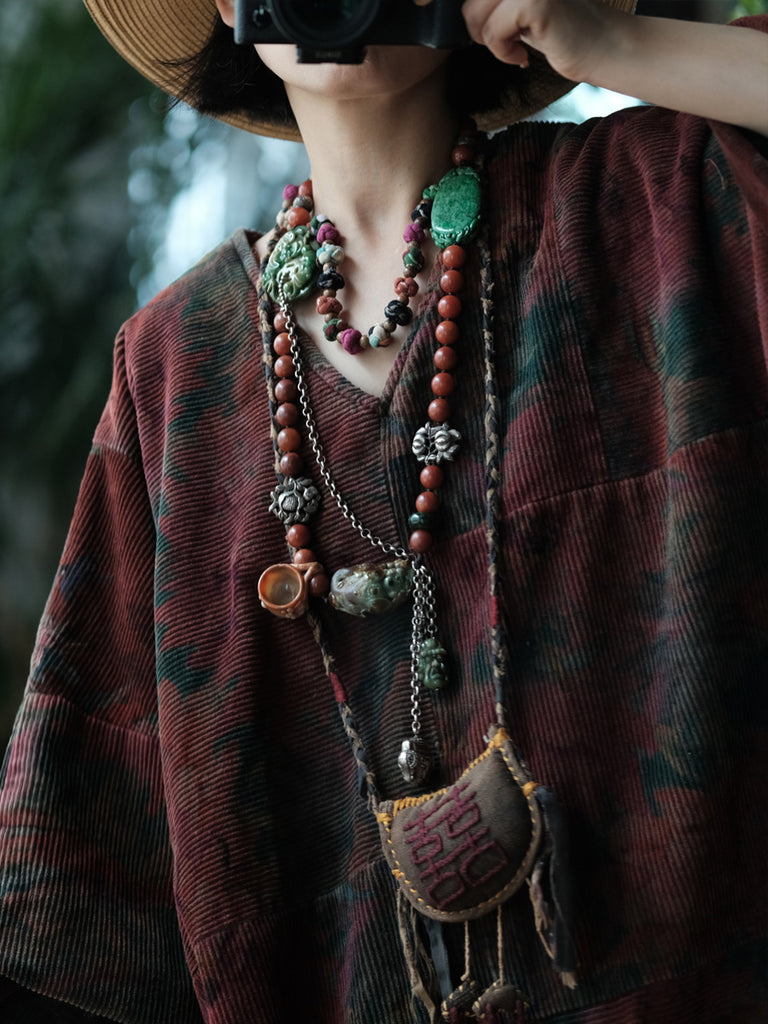 Women Vintage Winter Flower V-Neck Cotton Robe Coat