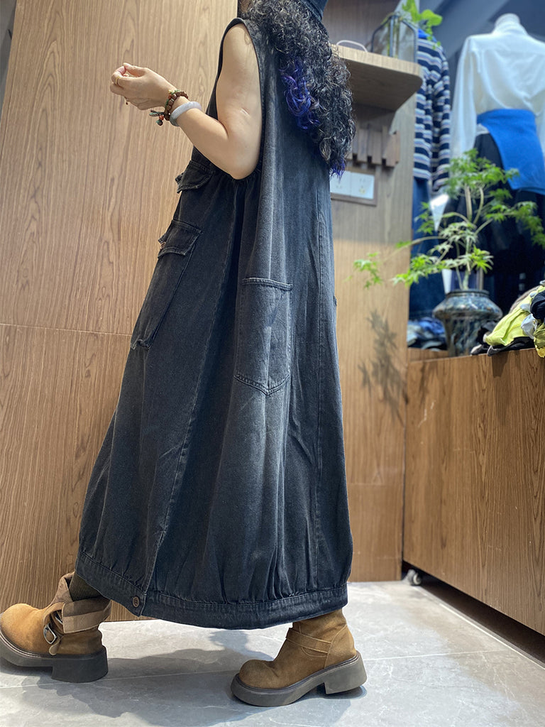 Women Summer Vintage Pocket V-Neck 100%Cotton Vest Dress