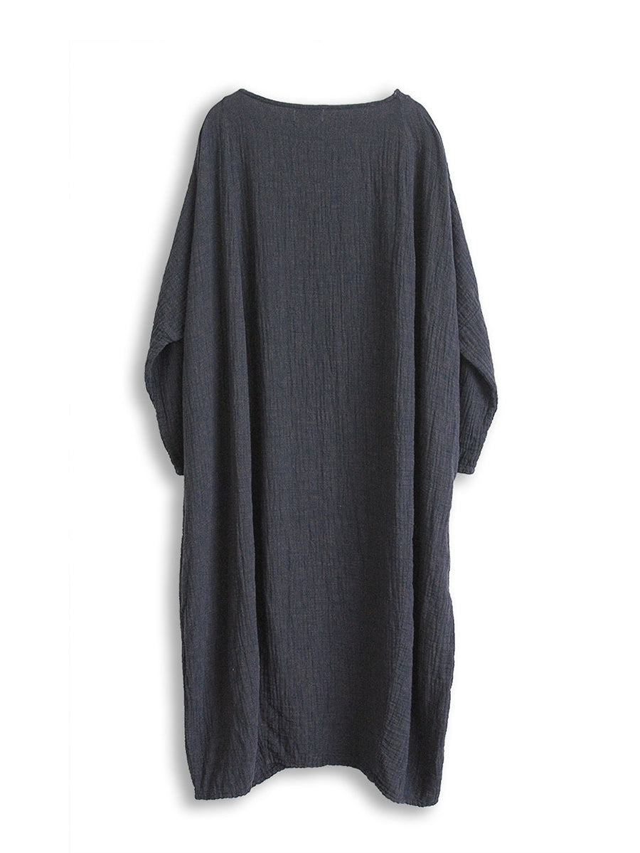 Women Casual Autumn Solid O-Neck Cotton Linen Dress