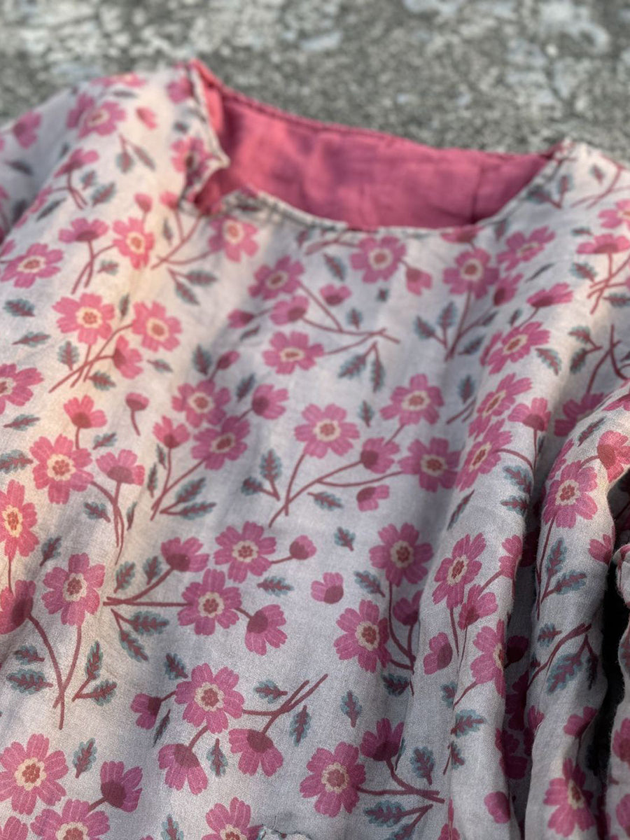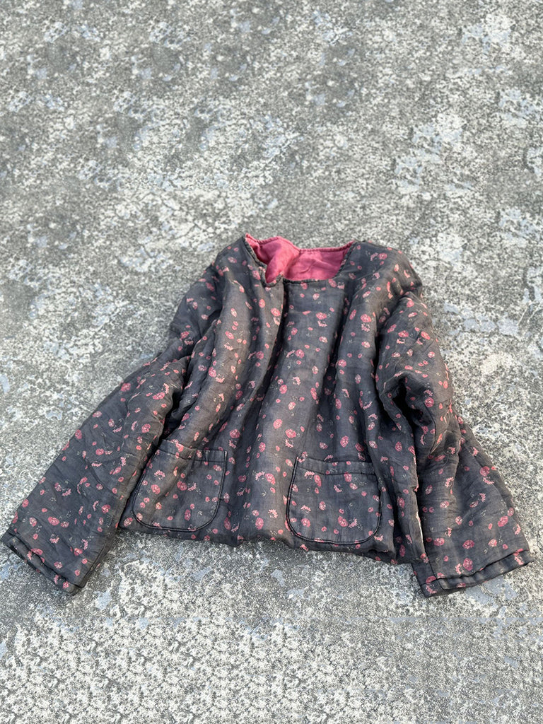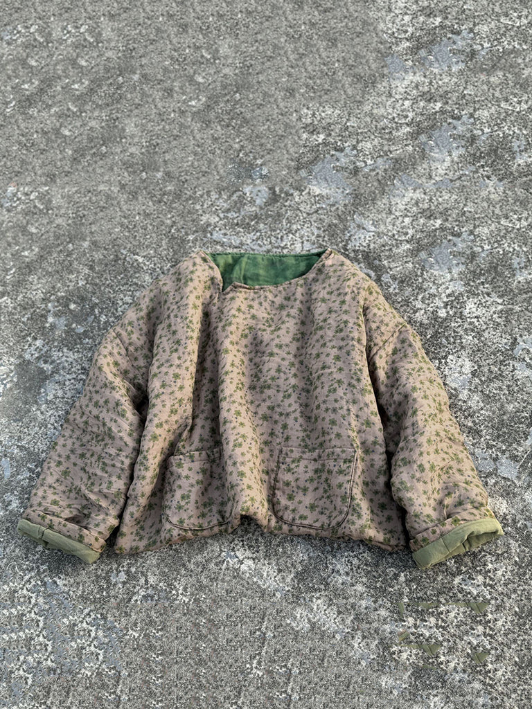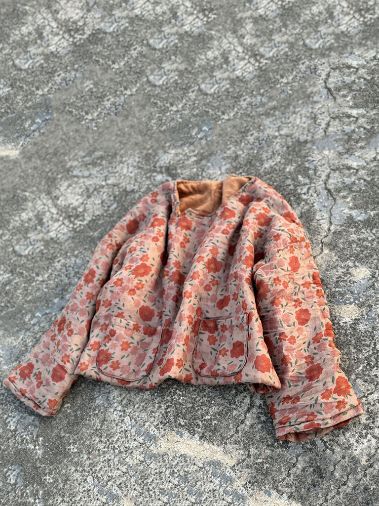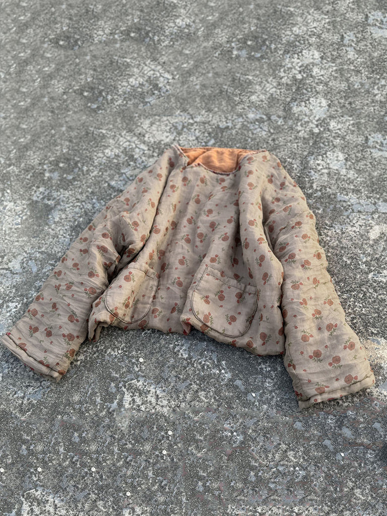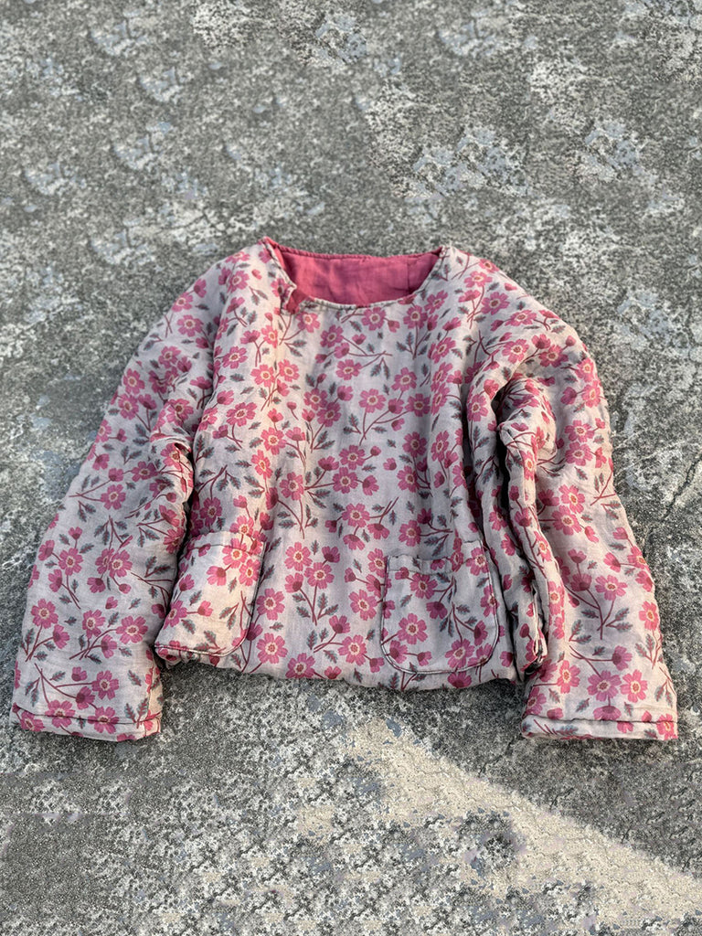 Women Vintage Flower O-Neck 100%Ramie Padded Coat