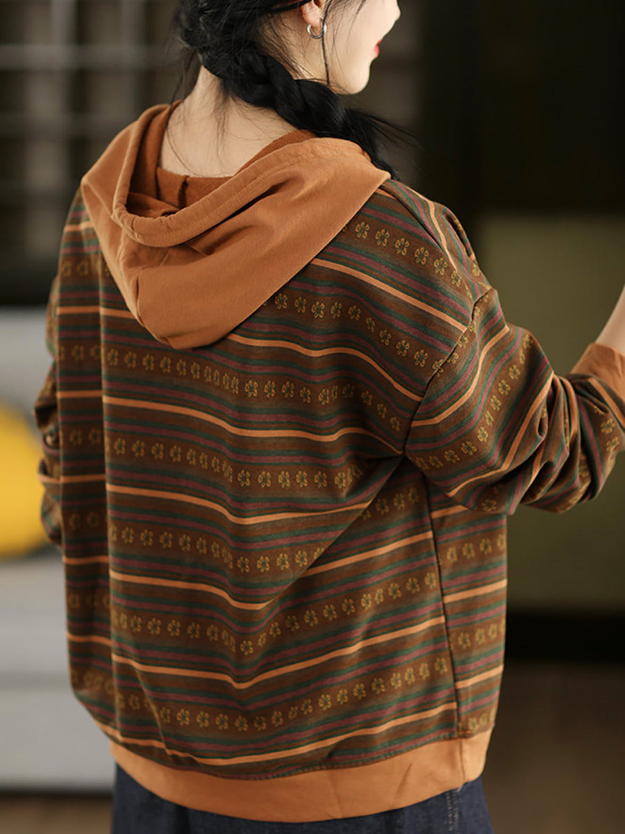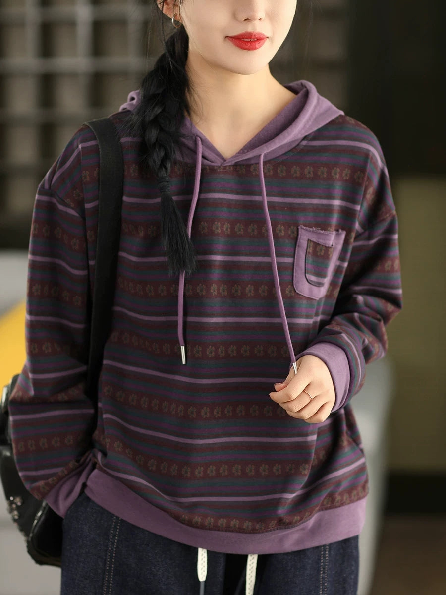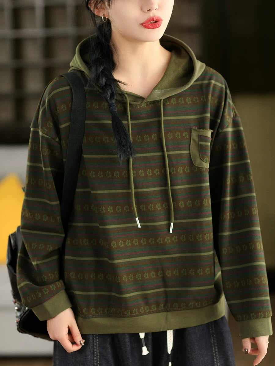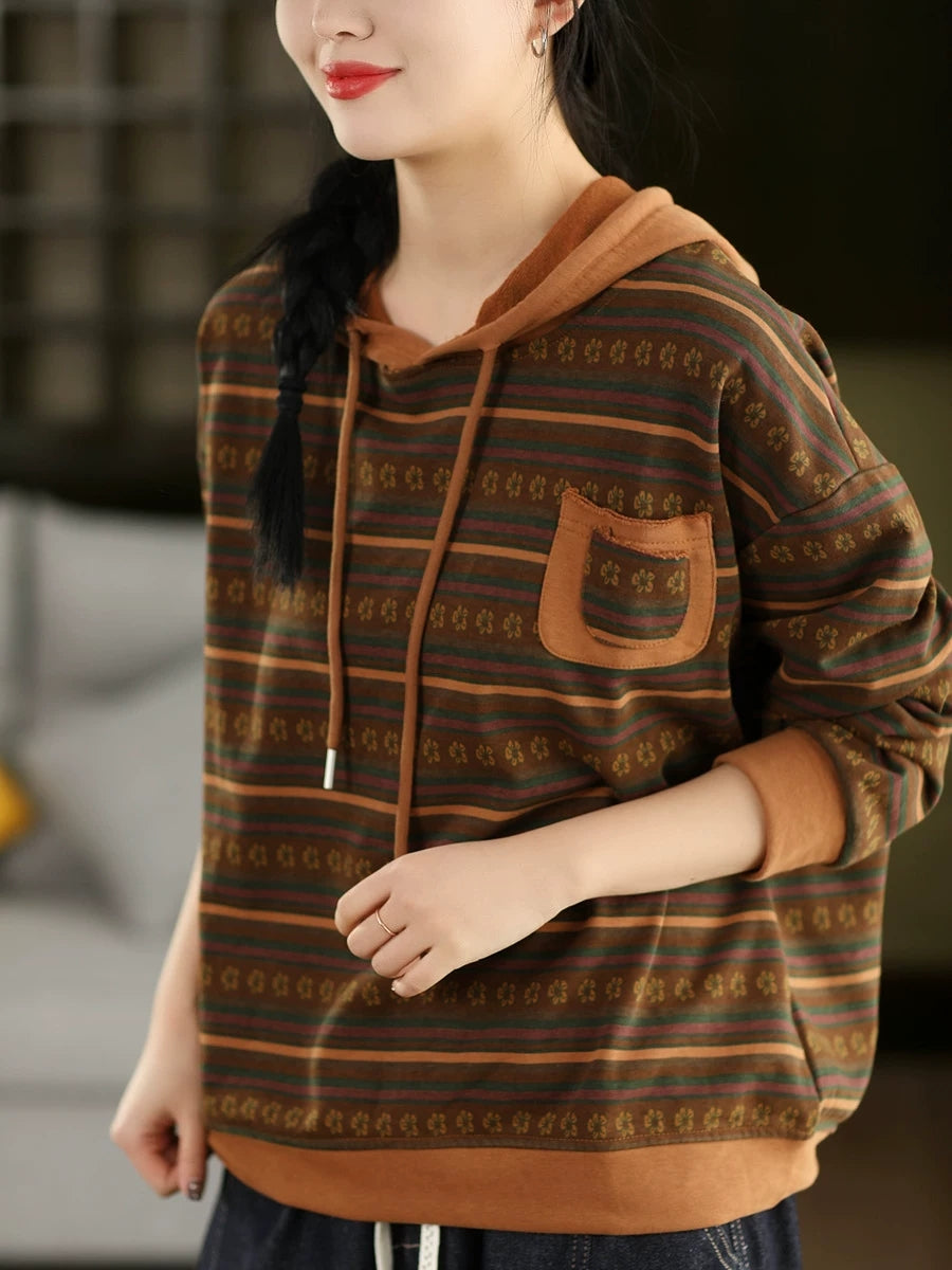 Women Retro Spring Stripe Hooded Sweater