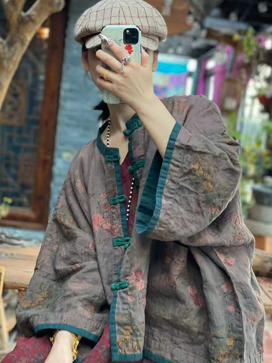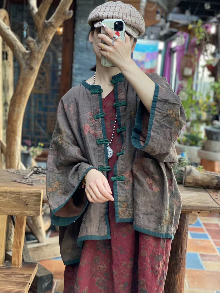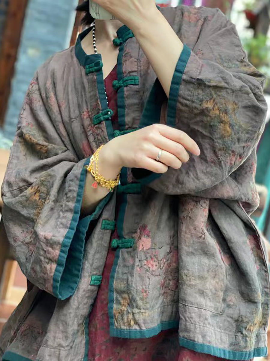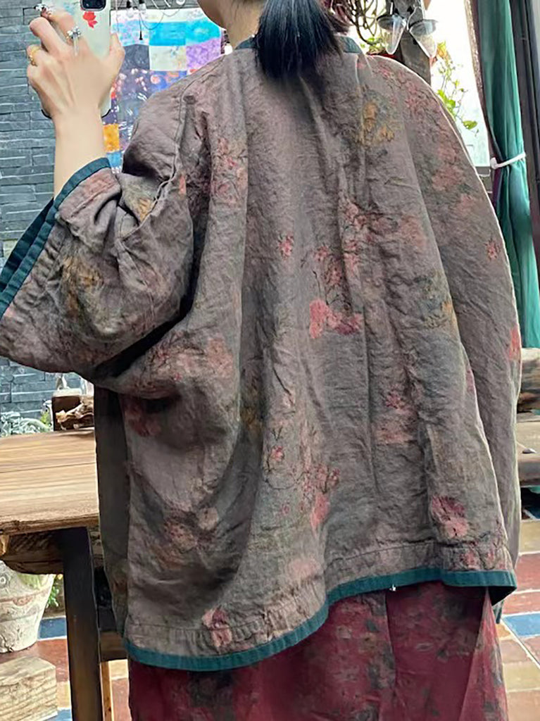 Dámské podzimní vinobraní květ Colorblock Button-up prádlo kabát