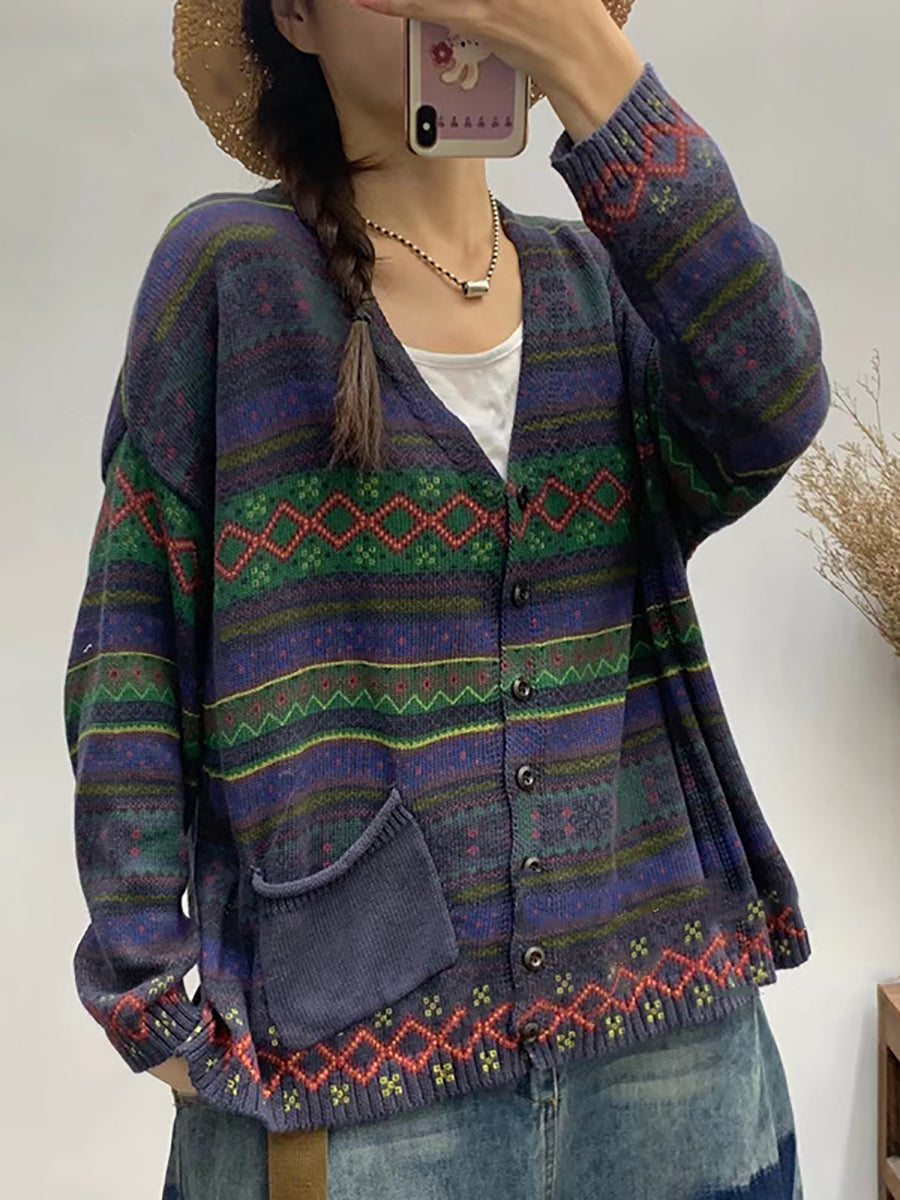 Dámský podzimní geometrický pletený svetr s výstřihem do V