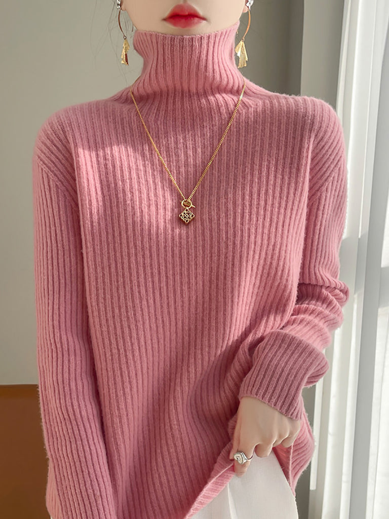 Dámský podzimní ležérní svetr s vlněným úpletem do O s výstřihem