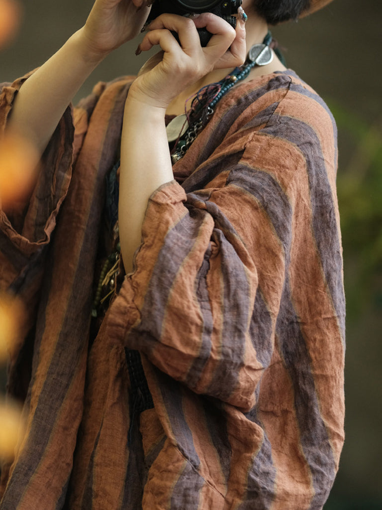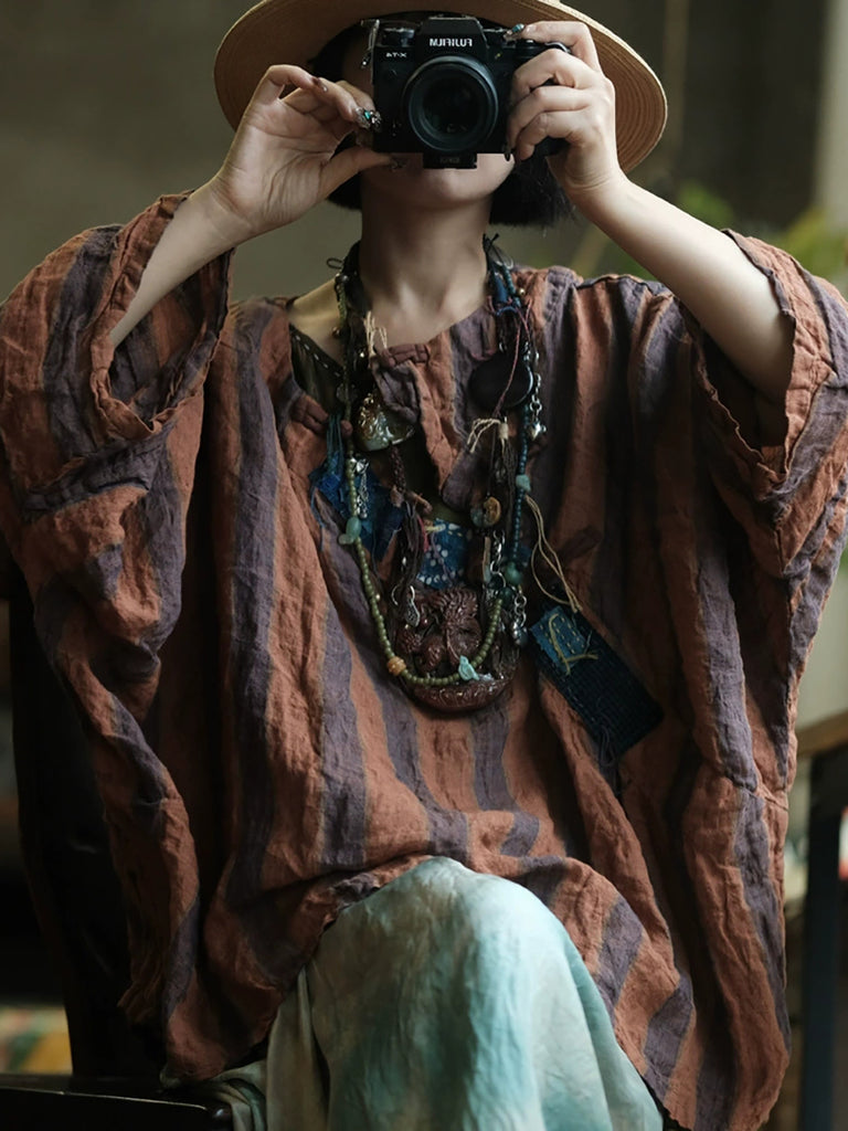 Dame Sommerskjorte i hør med retrostriber og O-hals