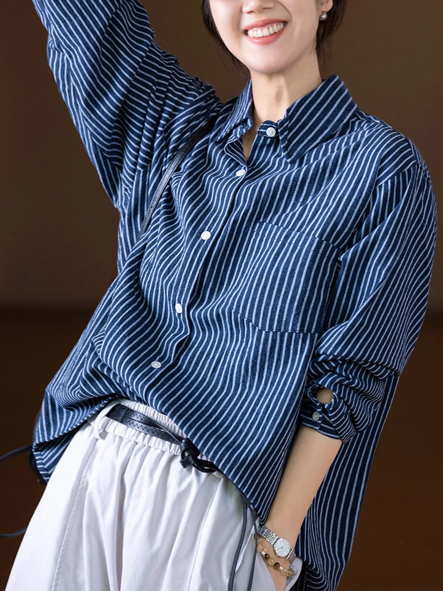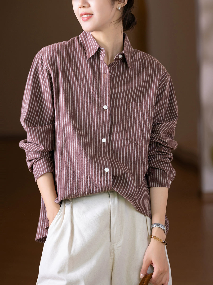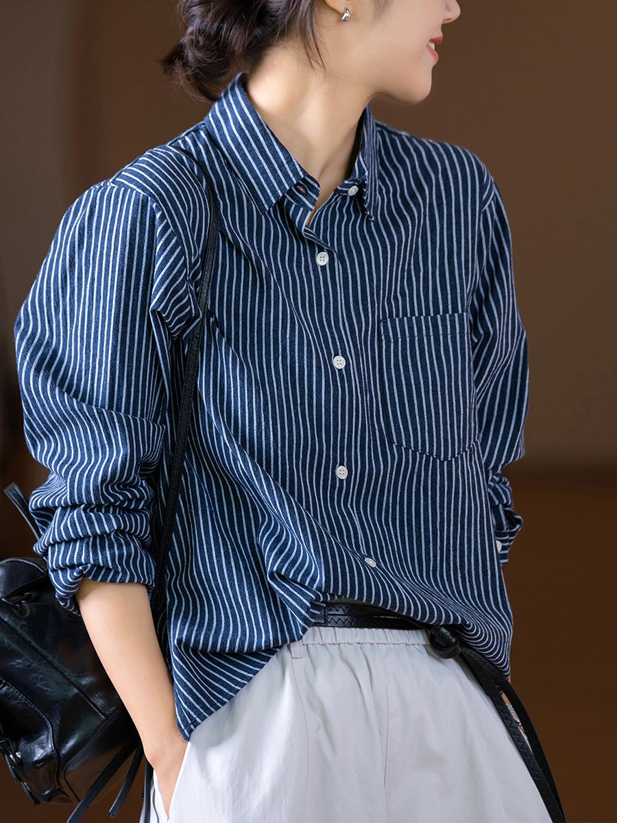 Dameskjorte med striber og nedadgående krave i 100% bomuld