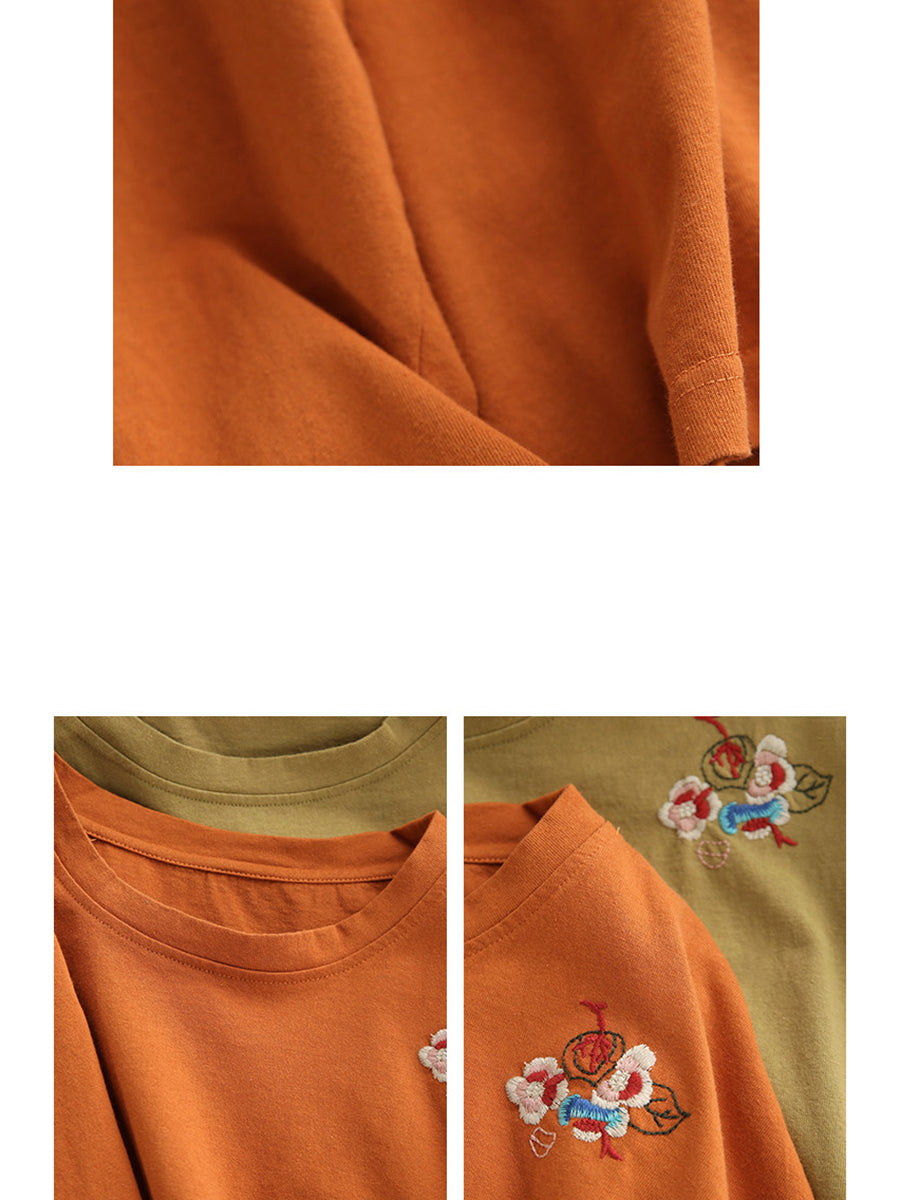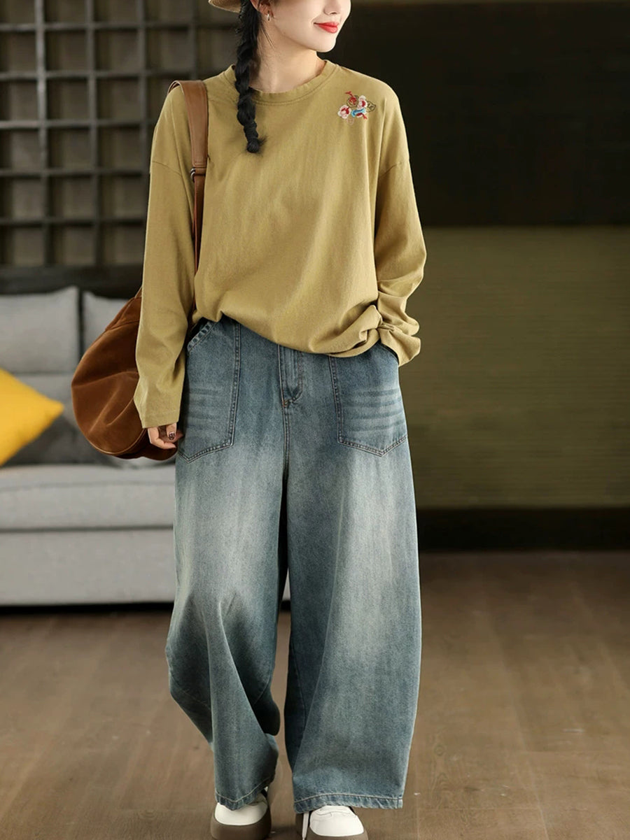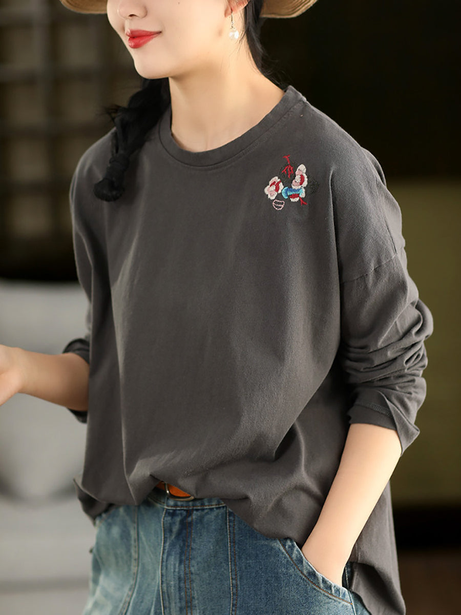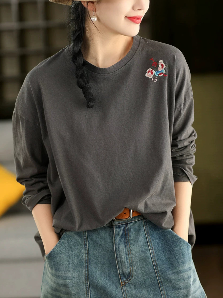 Kvinders forårsbluse med kunstnerisk broderi og O-hals i 100% bomuld