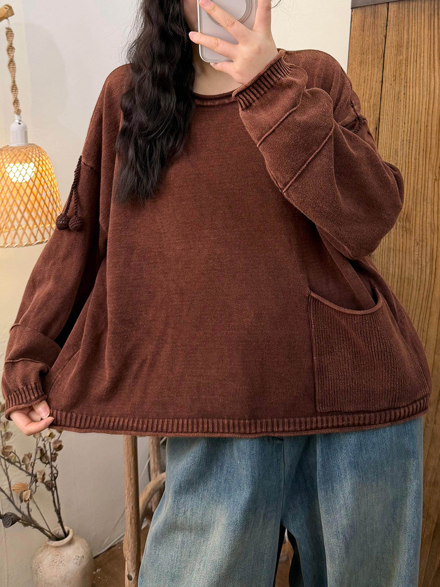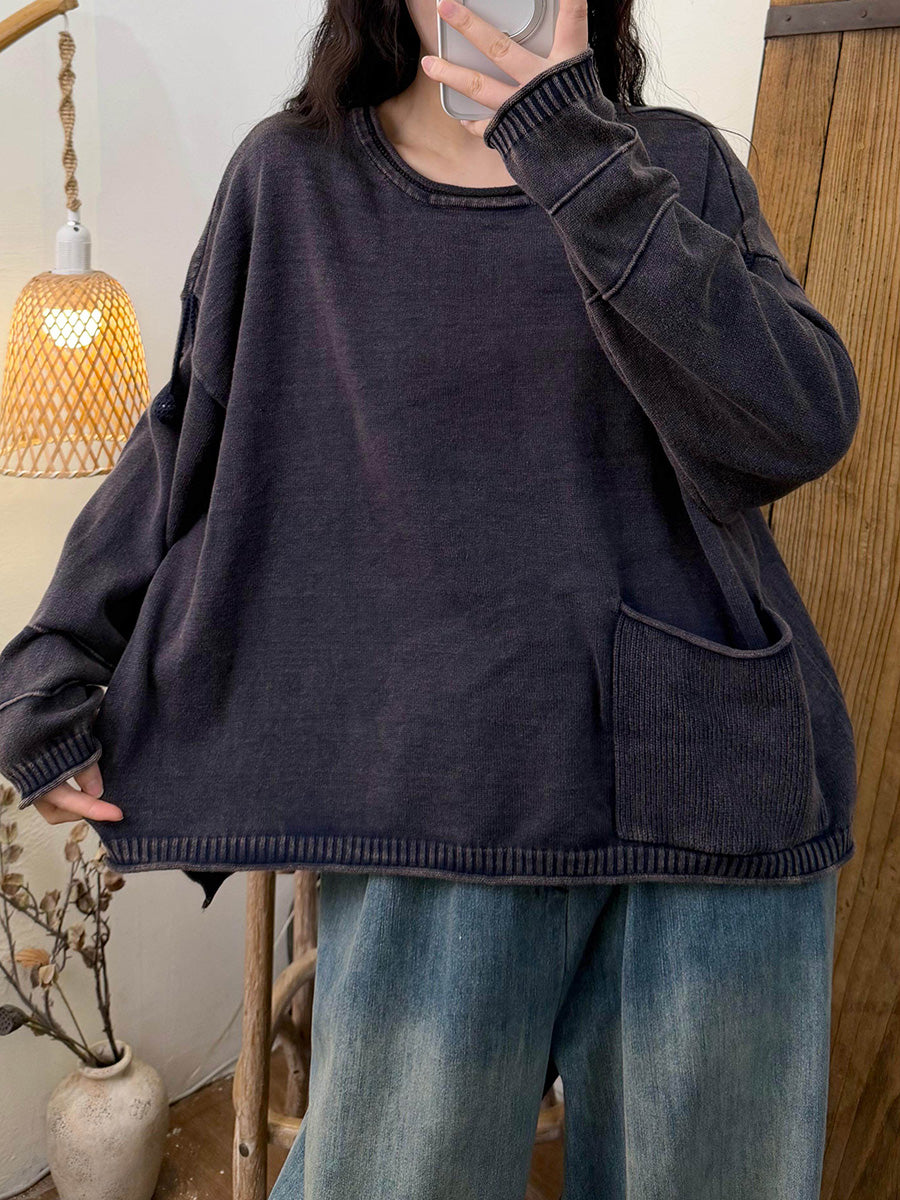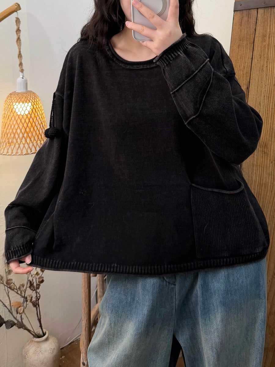 Damen-Retro-Herbstbluse in Unifarben mit Tasche und Rundhalsausschnitt