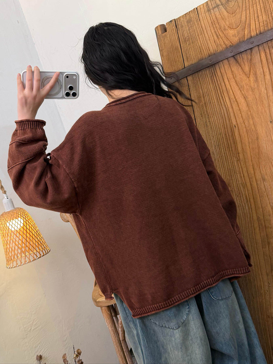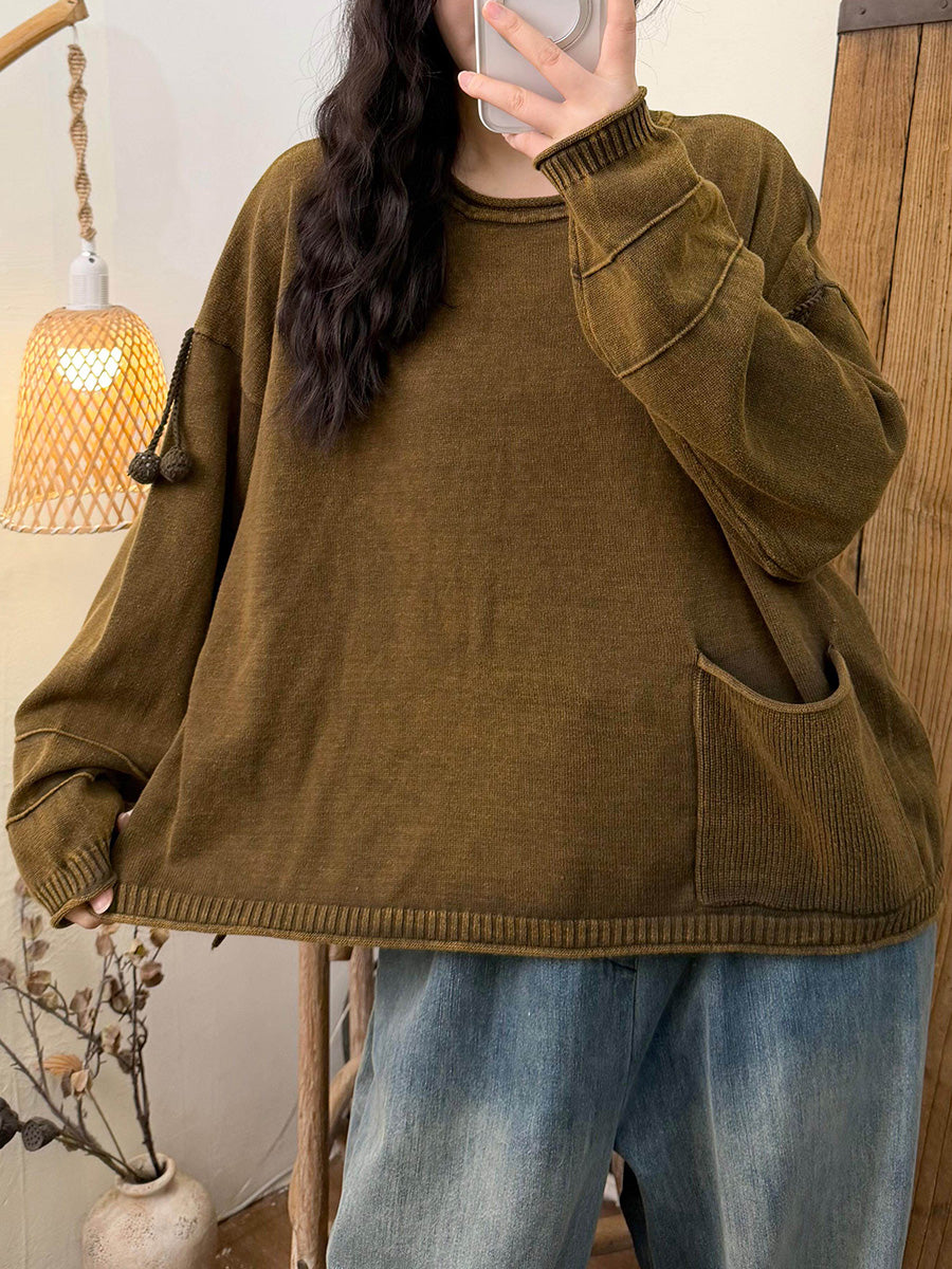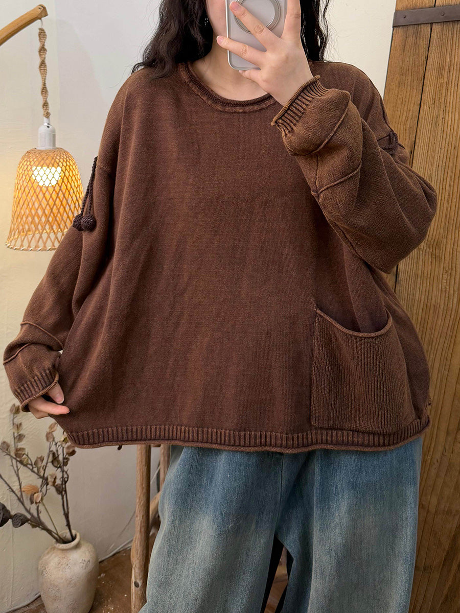Damen-Retro-Herbstbluse in Unifarben mit Tasche und Rundhalsausschnitt