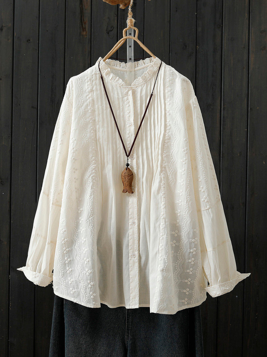 Damen Frühlingsbluse mit kunstvoller Stickerei und Raffungen aus 100 % Baumwolle