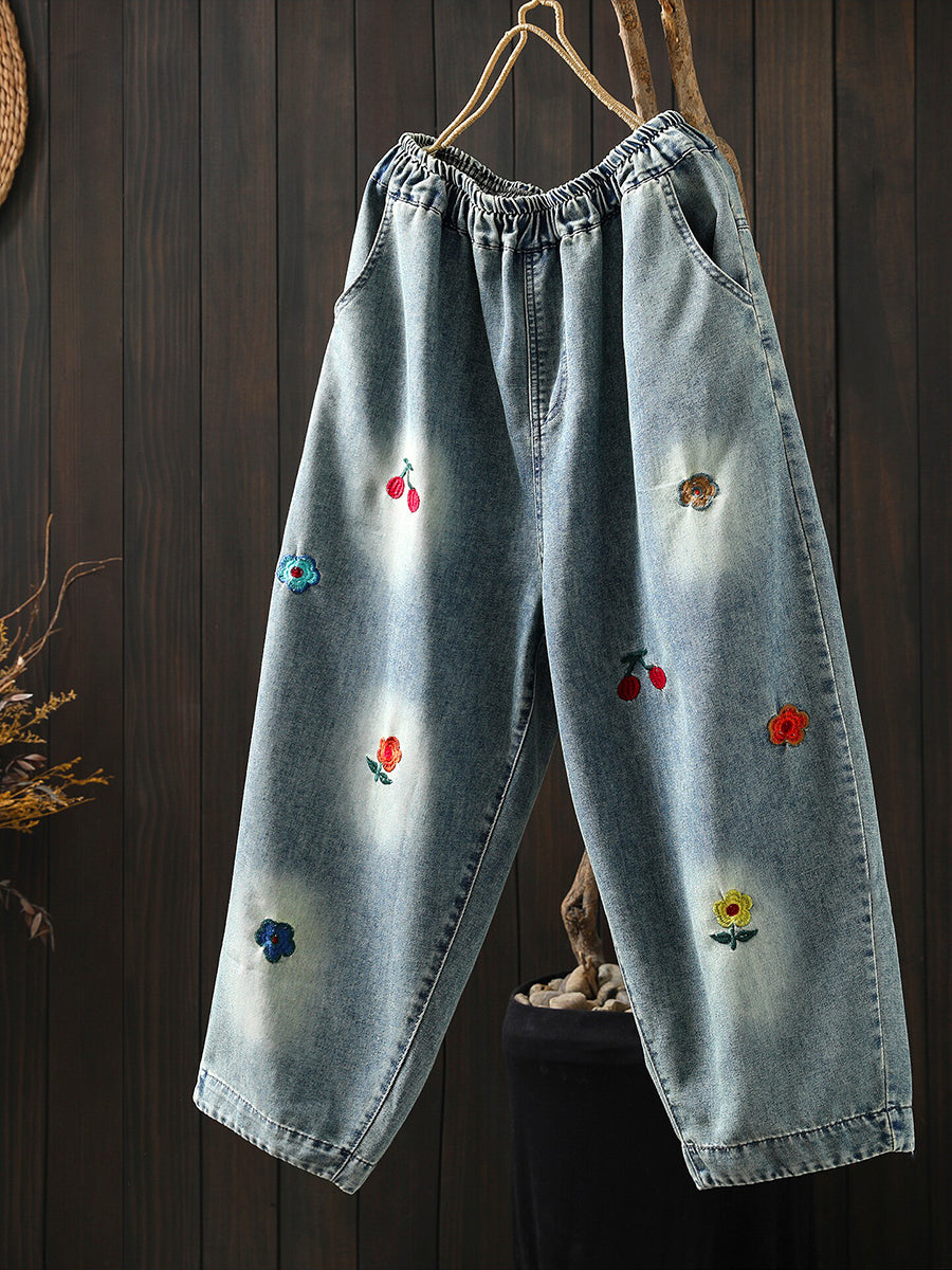 Damen Frühling Vintage Denim Haremshose mit Stickerei