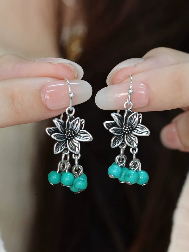 Γυναικεία σκουλαρίκια με φούντες και έθνικ κράμα Lotus, τιρκουάζ χάντρες