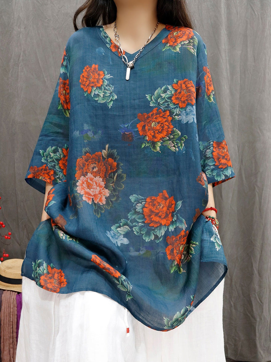 Γυναικεία Μπλούζα με V-Neck σε Στυλ Άνοιξης Artsy Flower από 100% Ραμί