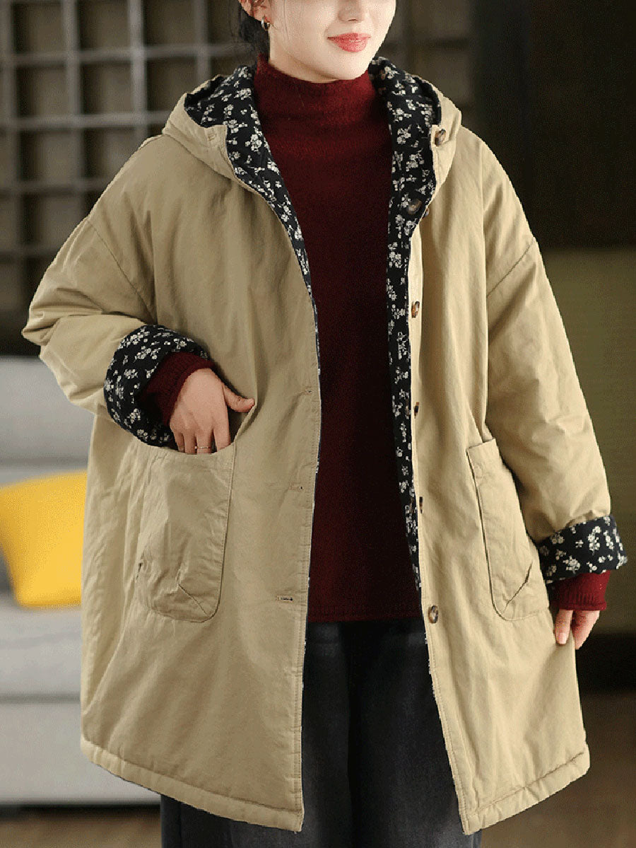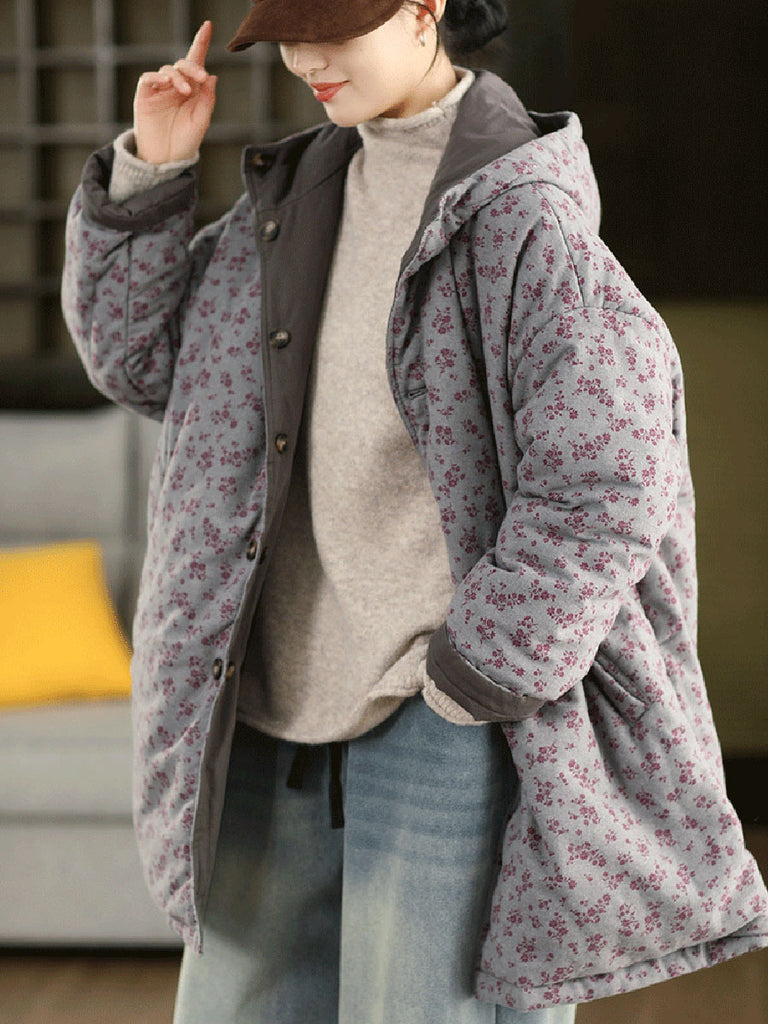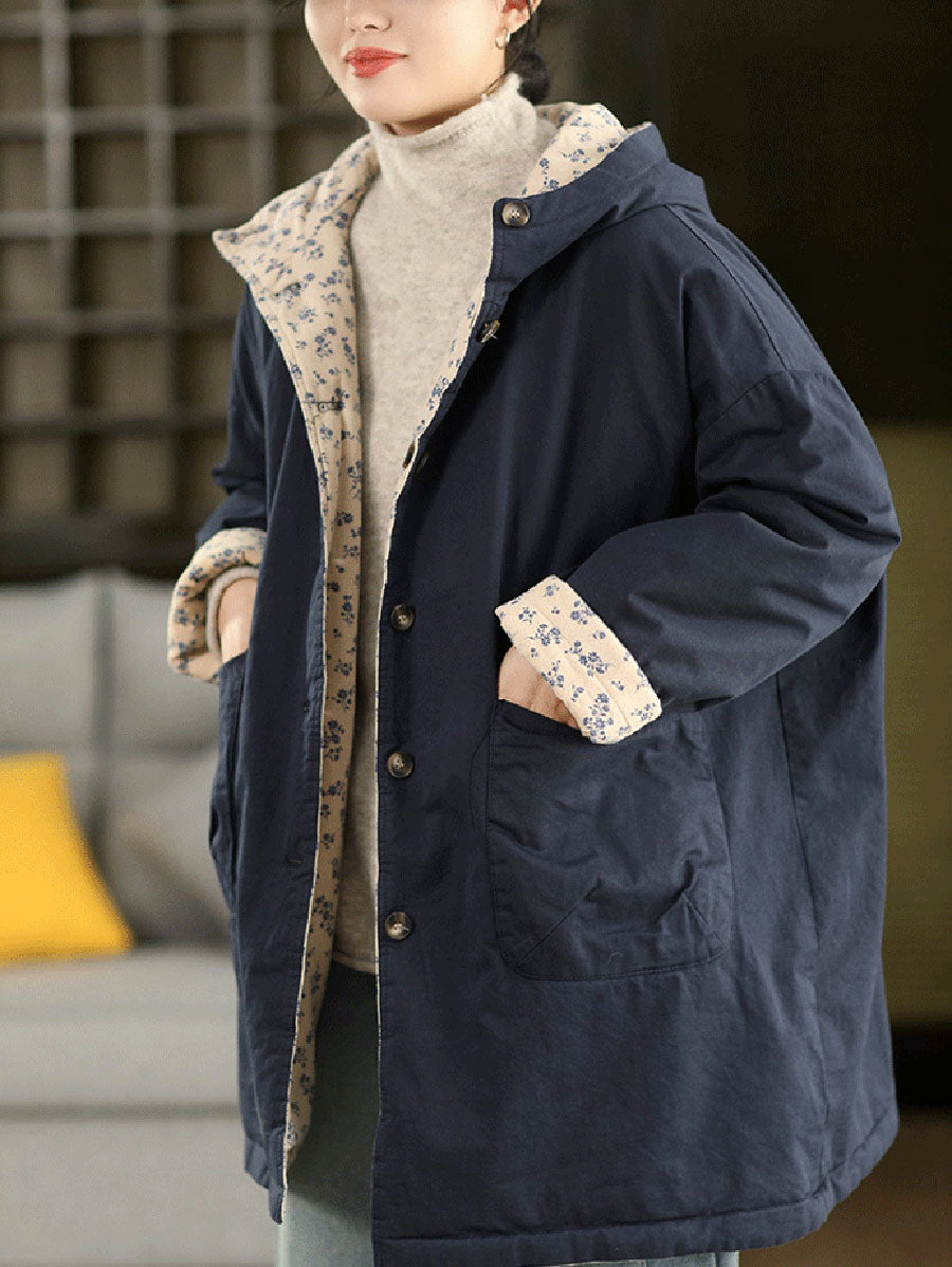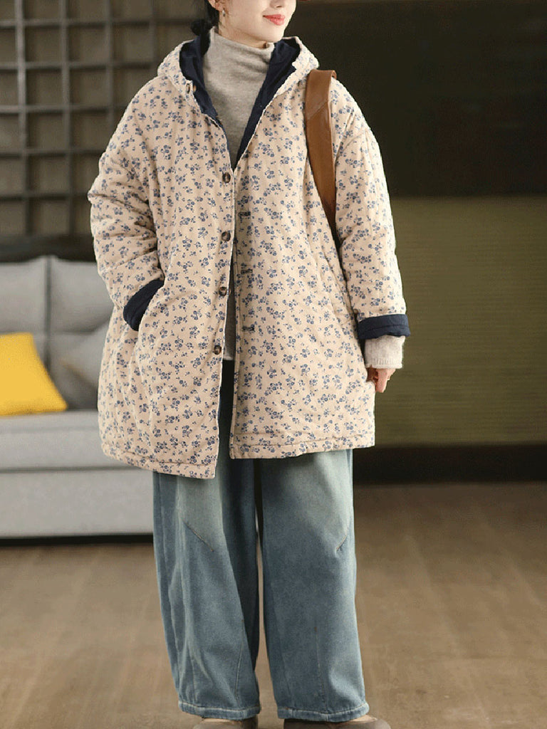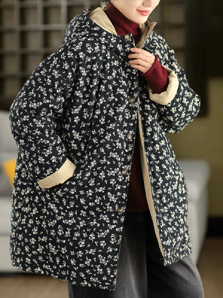 Γυναικείο Χειμερινό Παλτό με Κουκούλα, Φλοράλ, 100% Βαμβάκι, Δύο Όψεων