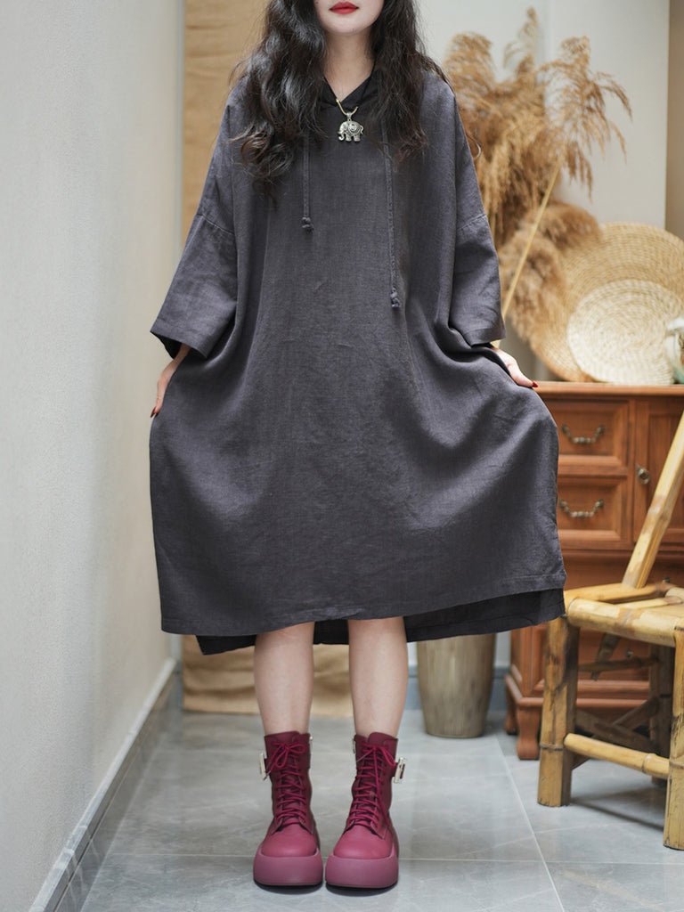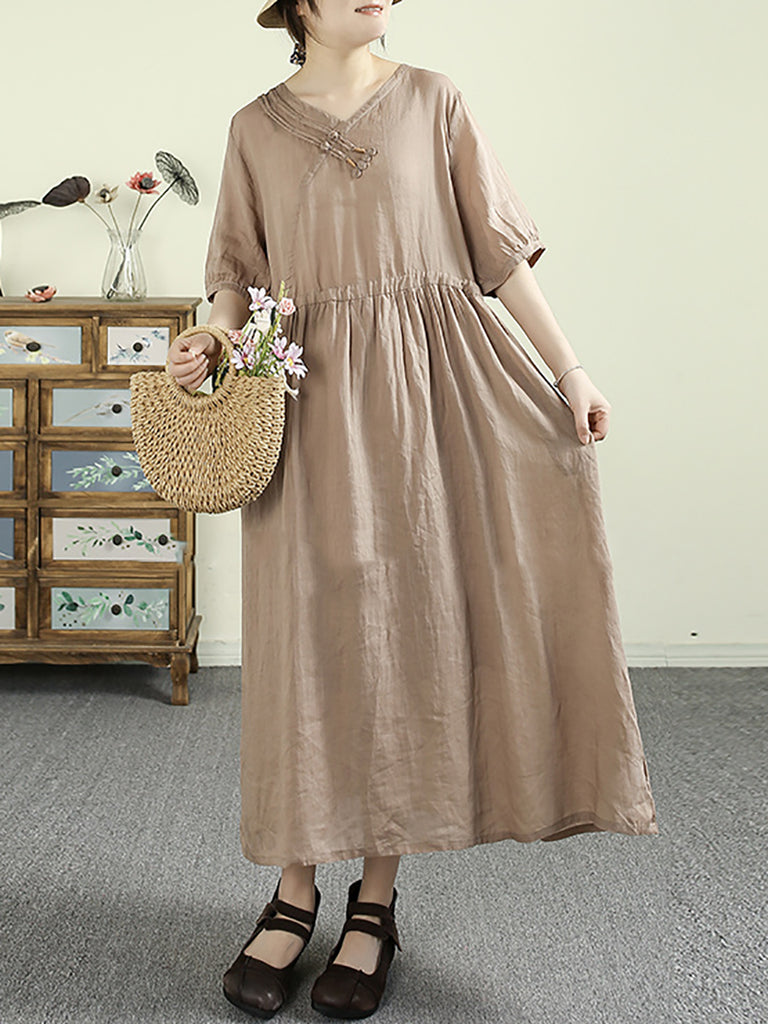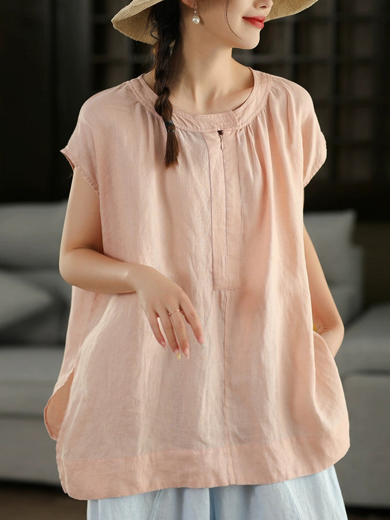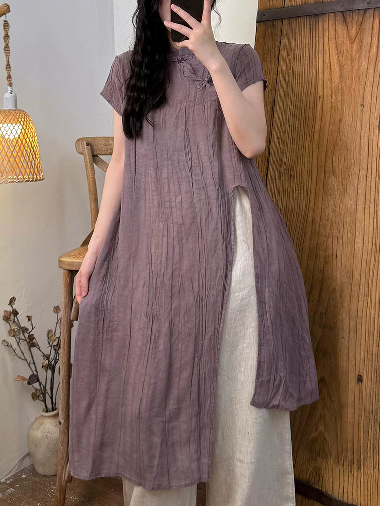 Women Autumn Retro Pure Color Linen Stand Collar Shirt