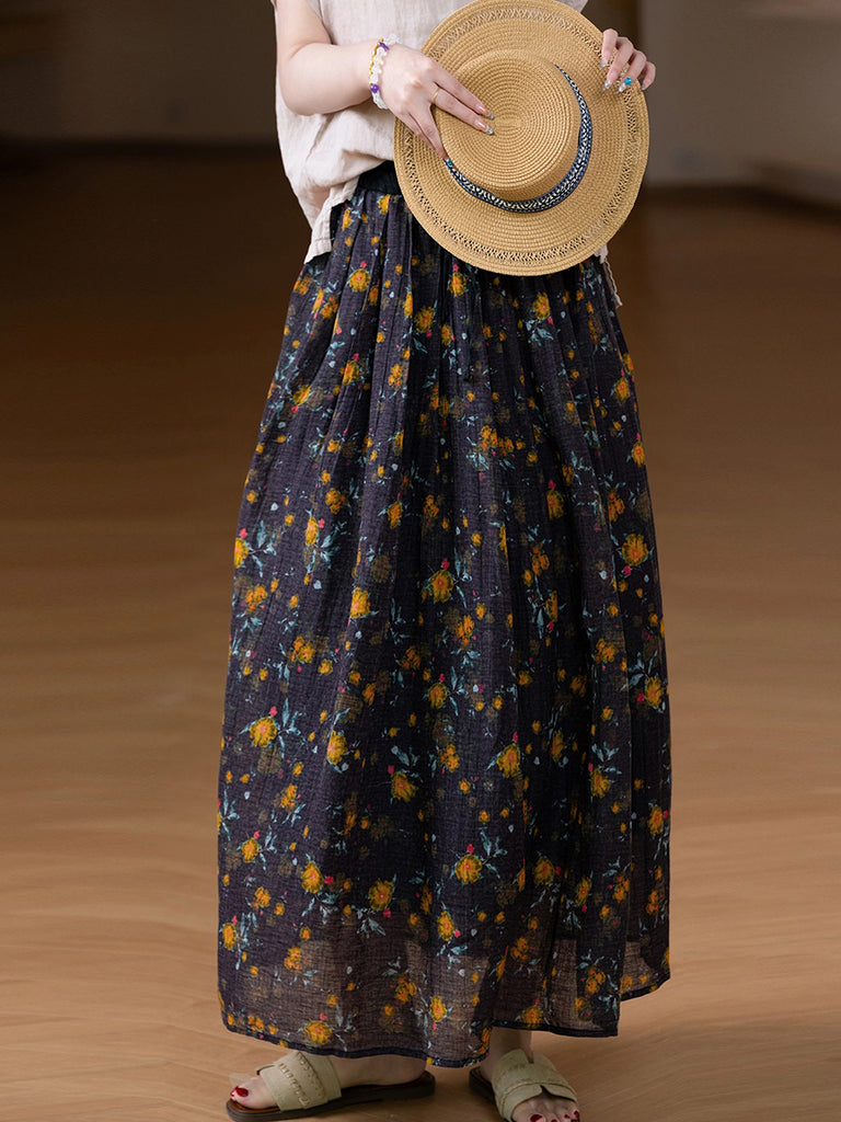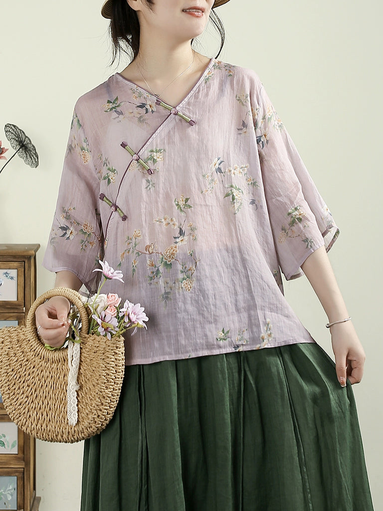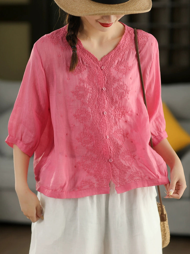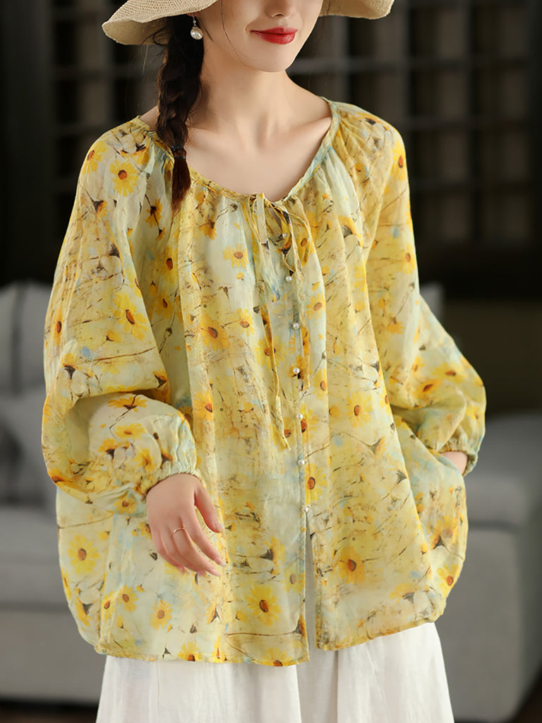 Women Retro Autumn Flower Turn-down Collar Linen Shirt