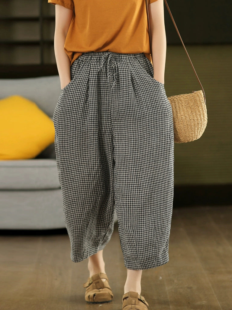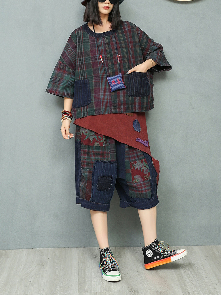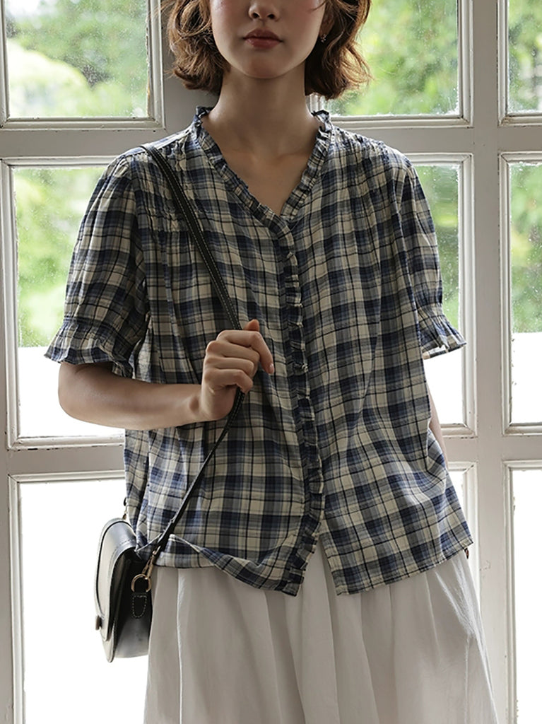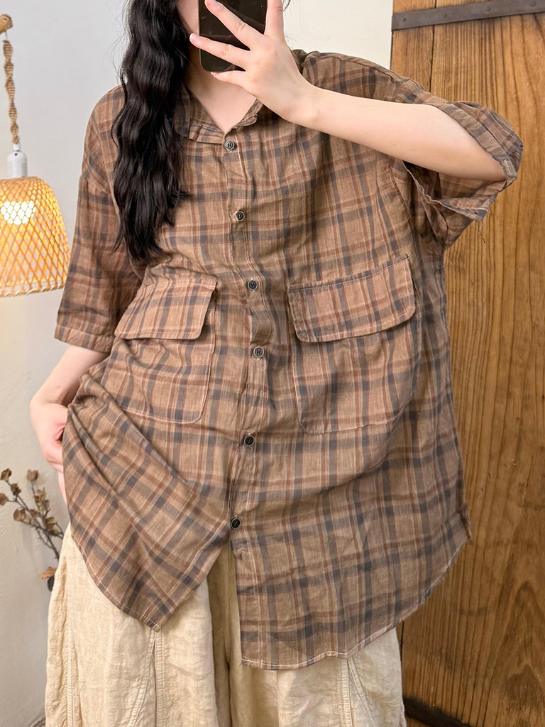 Women Artsy Autumn Plaid Turn-down Collar 100%Cotton Shirt