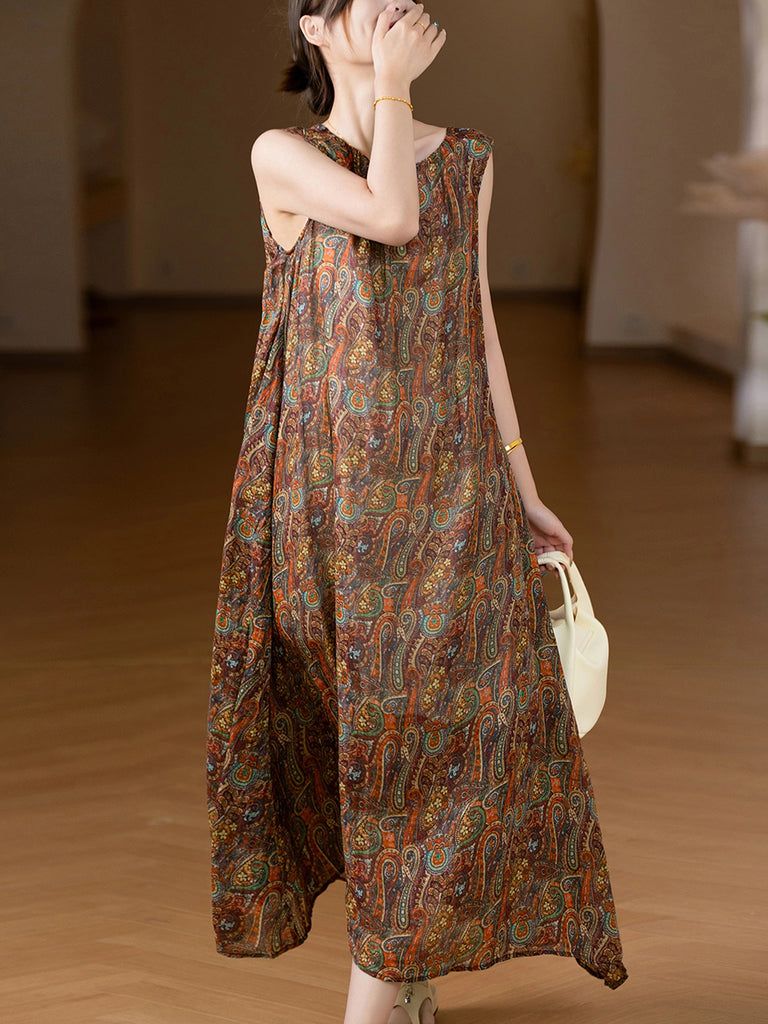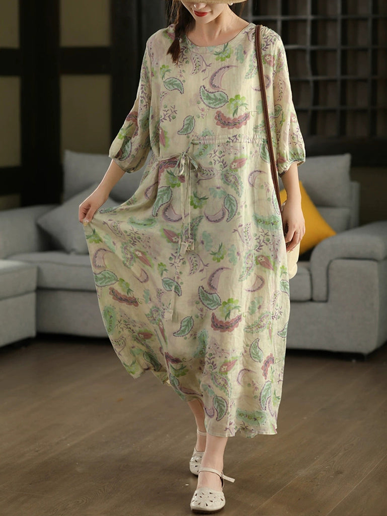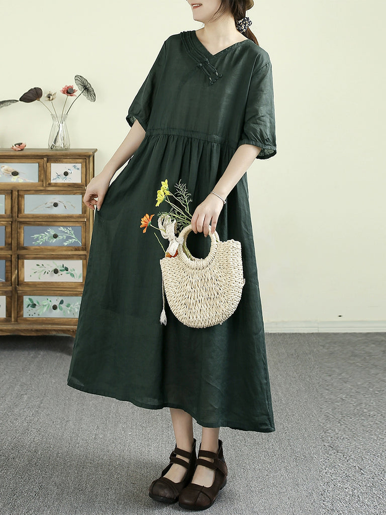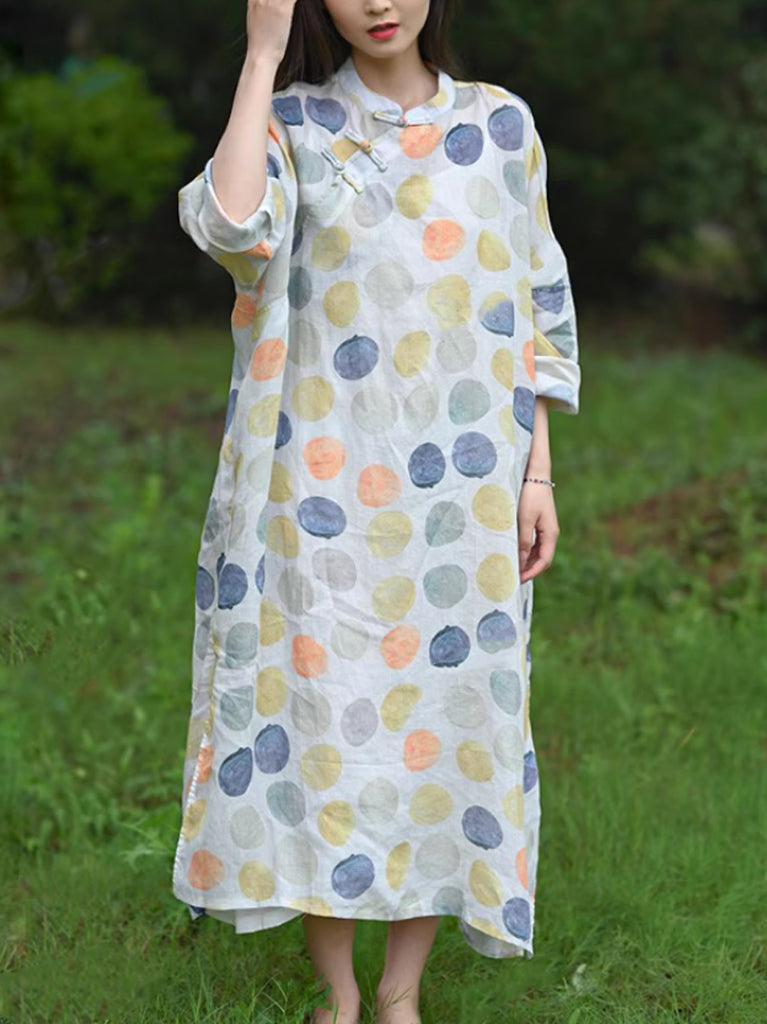 Women Autumn Vintage Flower Stand Collar 100%Cotton Dress
