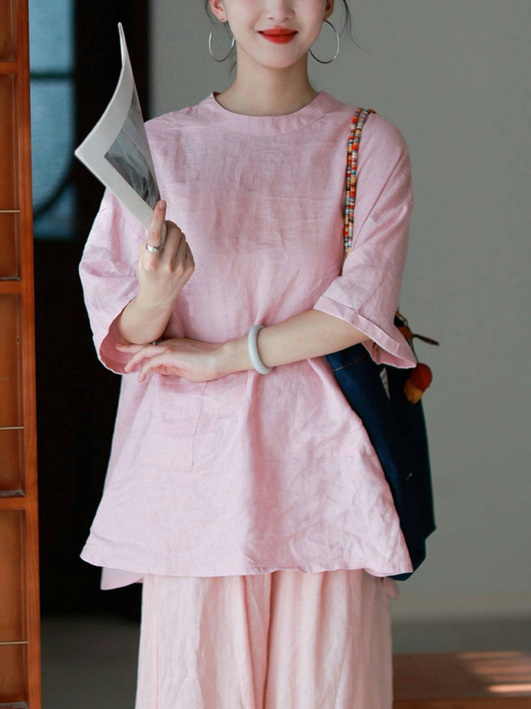 Women Winter Artsy Pure Color O-Neck 100%Cotton Shirt