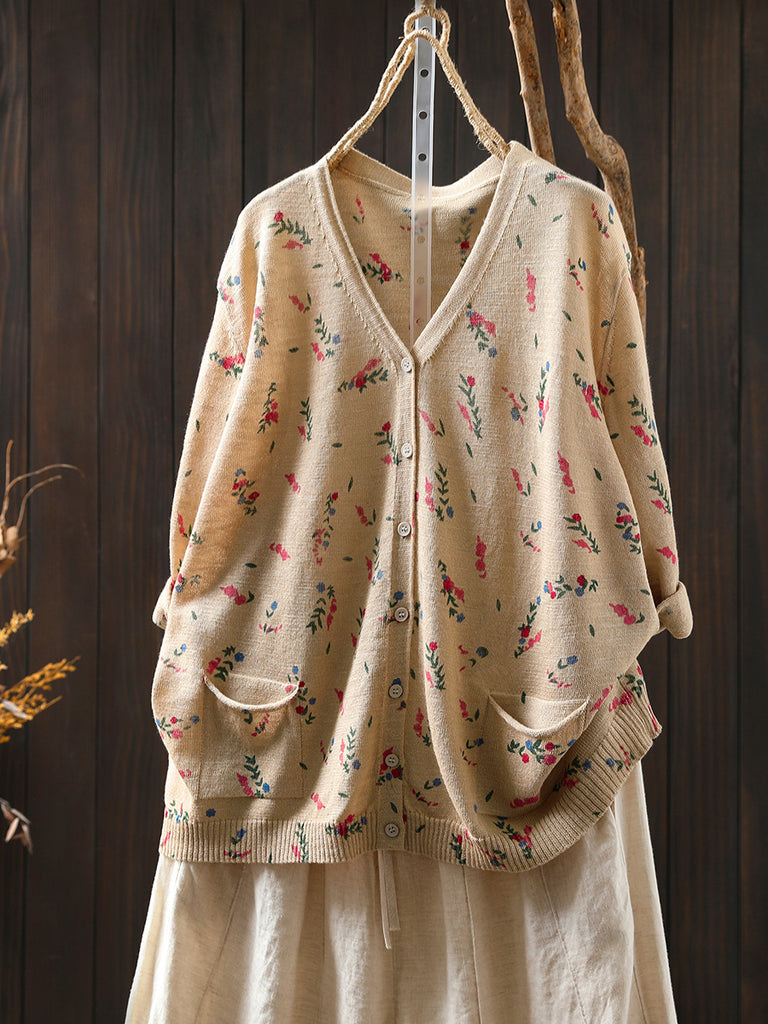 Women Retro Flower 100%Cotton V-Neck Padded Coat