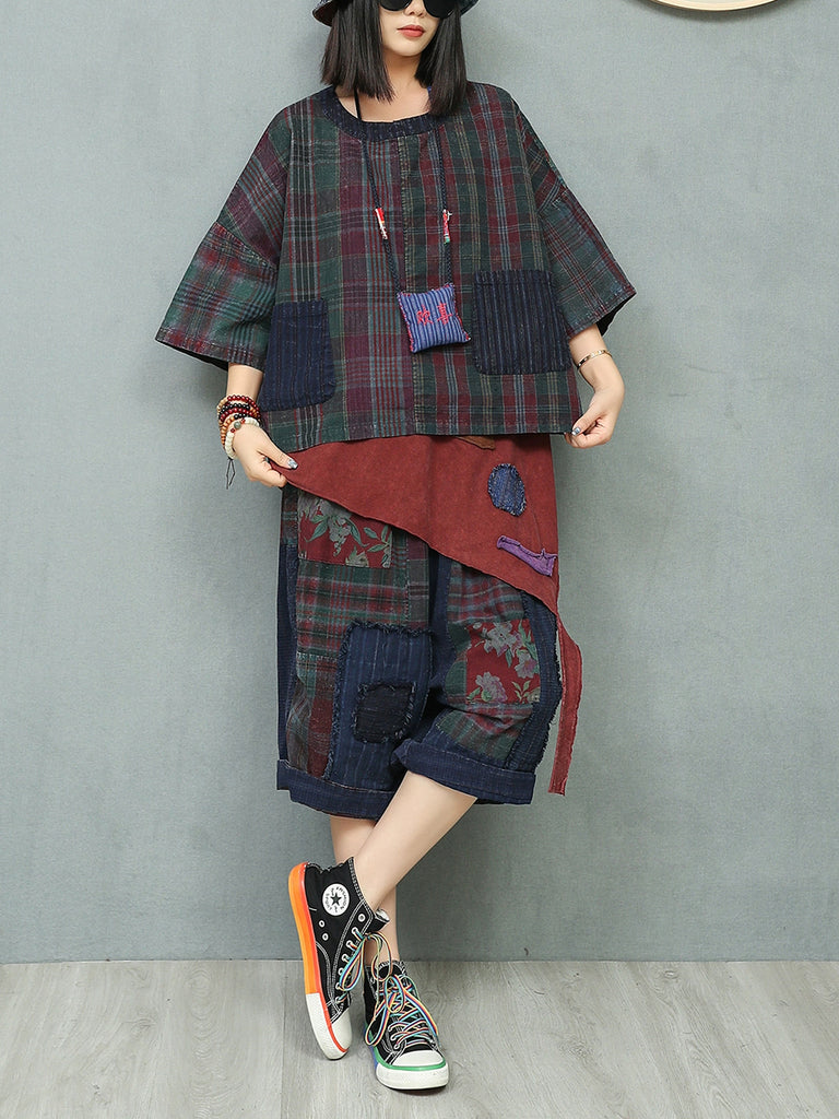 Women Winter Retro Patchwork O-Neck Padded Suits