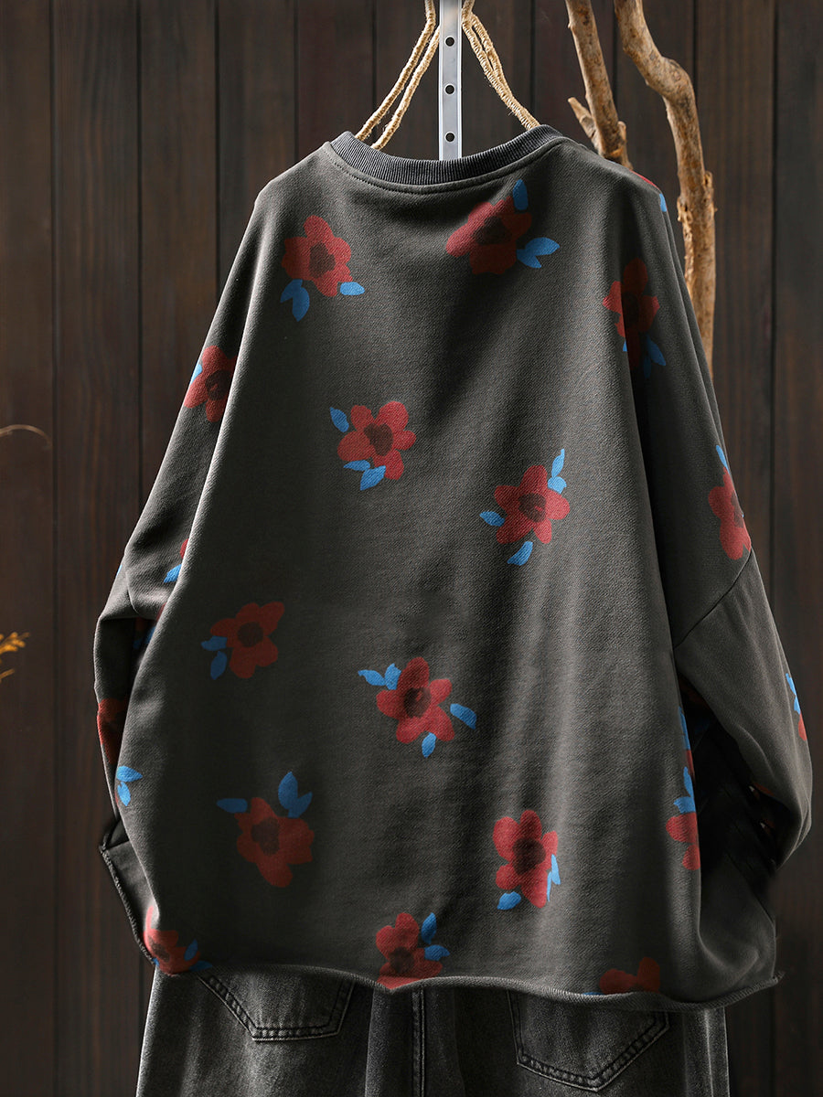 Plus Size Women Autumn Artsy Flower O-Neck Cotton Blouse