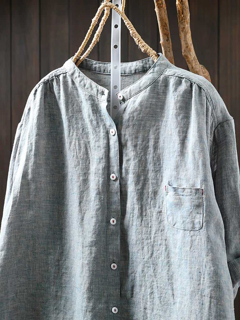 Plus Size Women Summer Pure Color Stand Collar 100%Linen Shirt