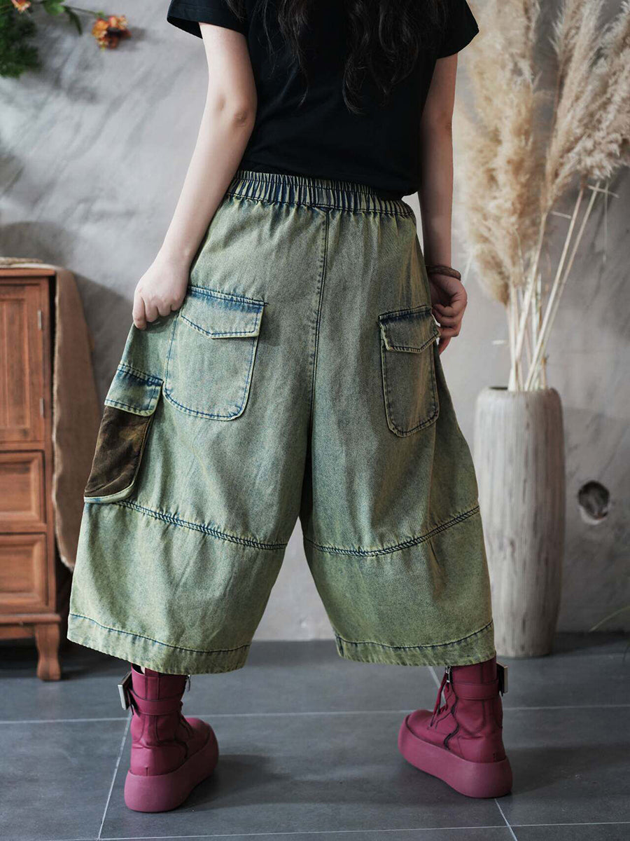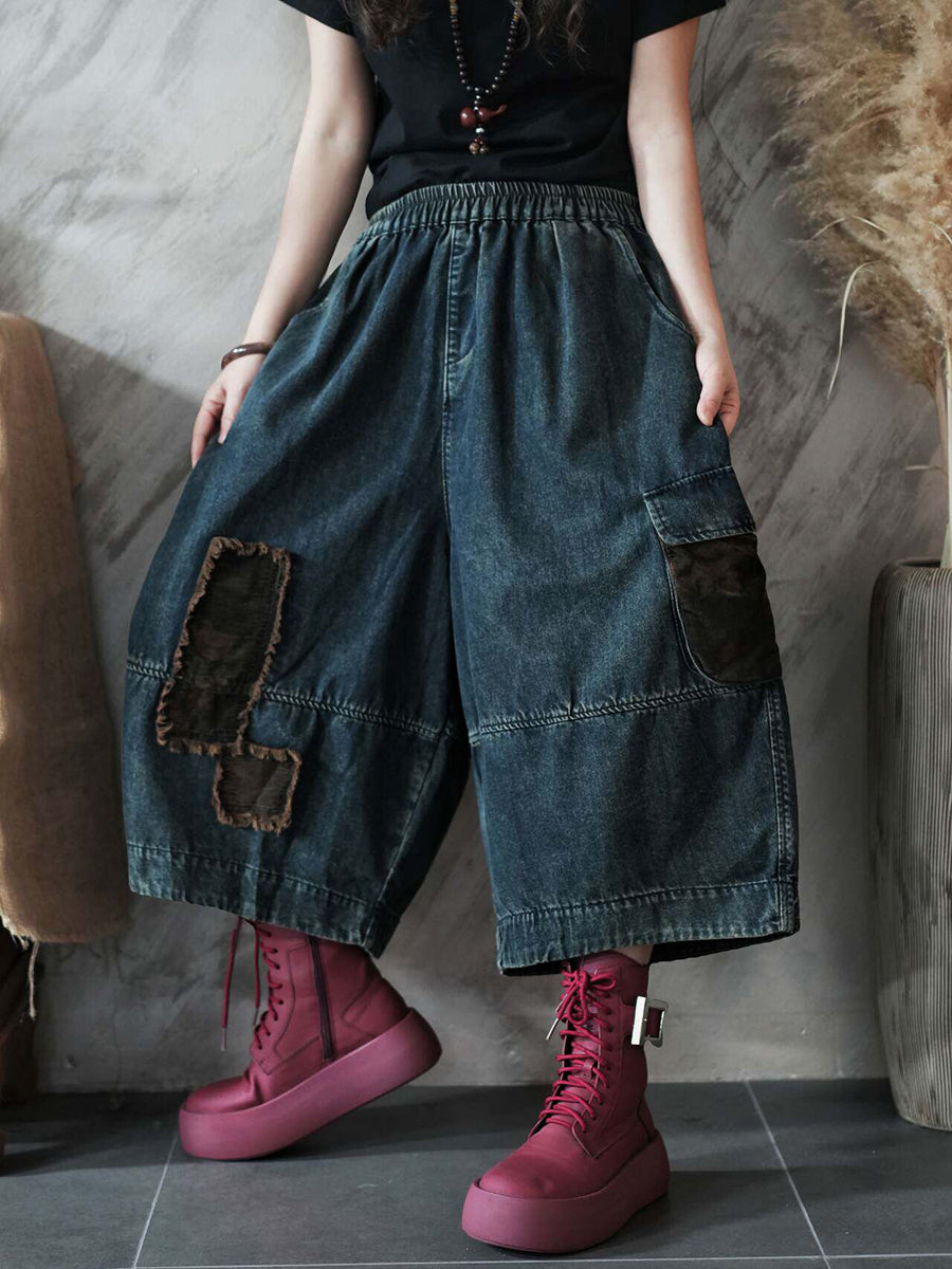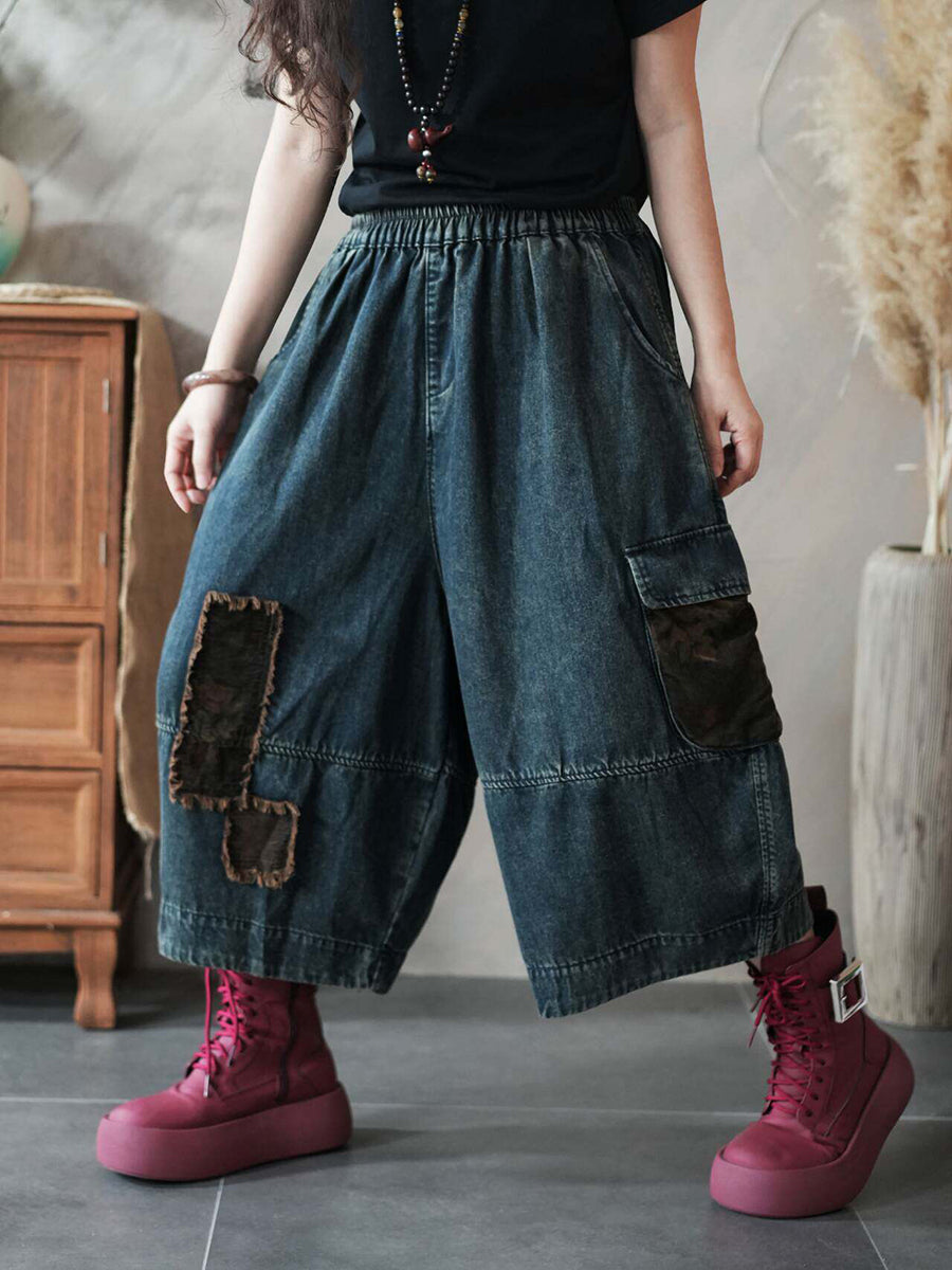 Women Summer Vintage Patchwork Denim Wide-leg Jeans