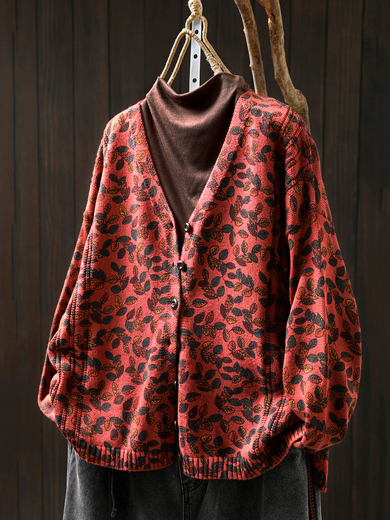 Women Autumn Leaf Knitted V-Neck Cardigan Sweater