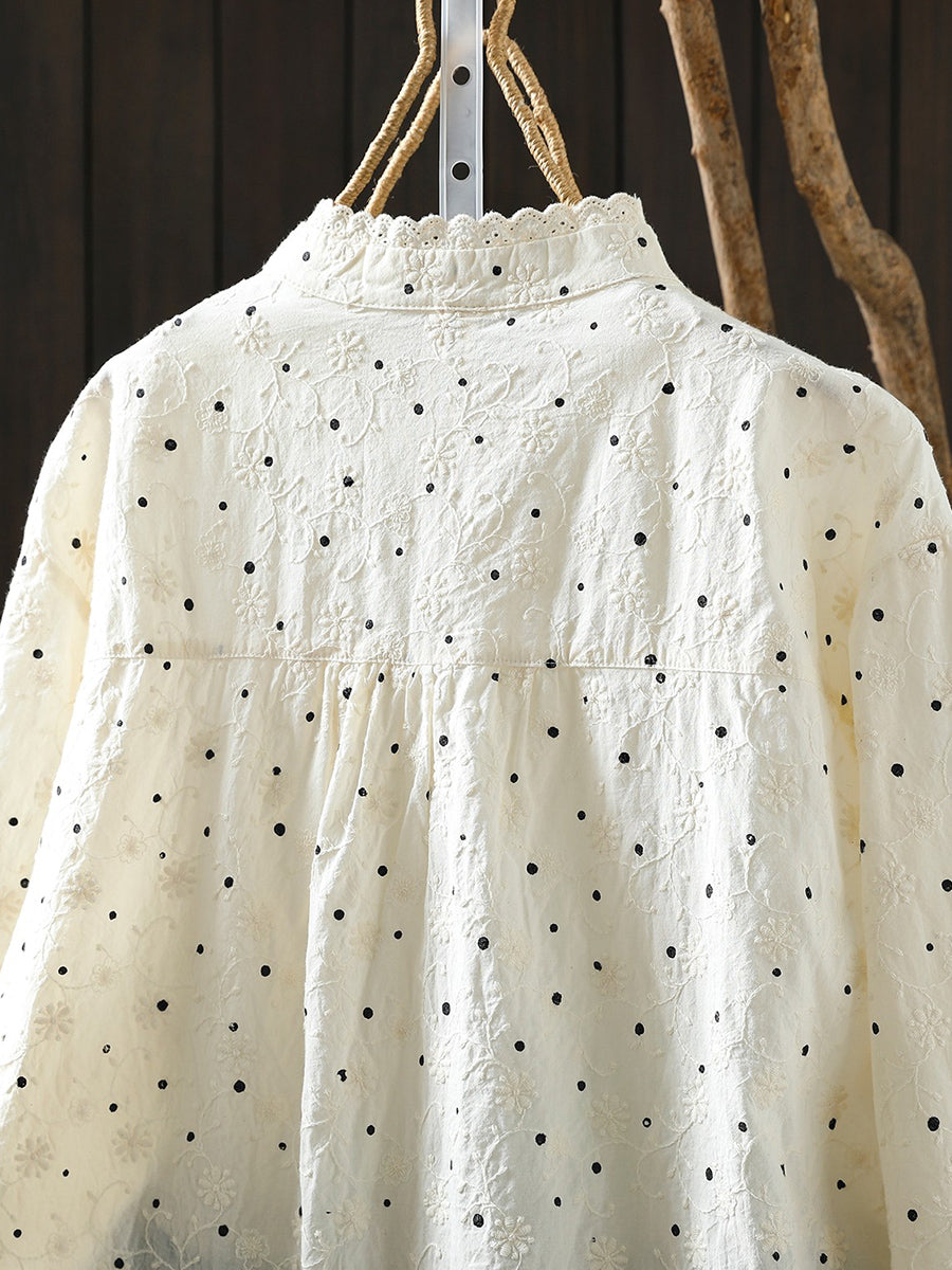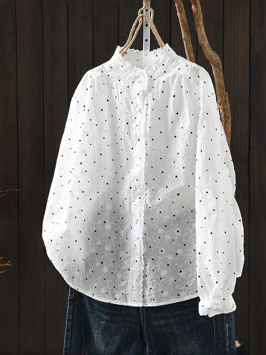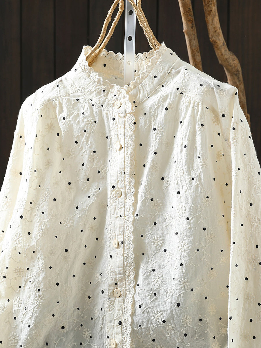 Women Artsy Spring Dot Embroidery 100%Cotton Stand Collar Blouse