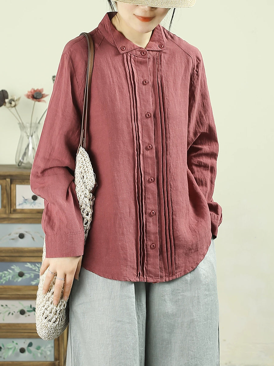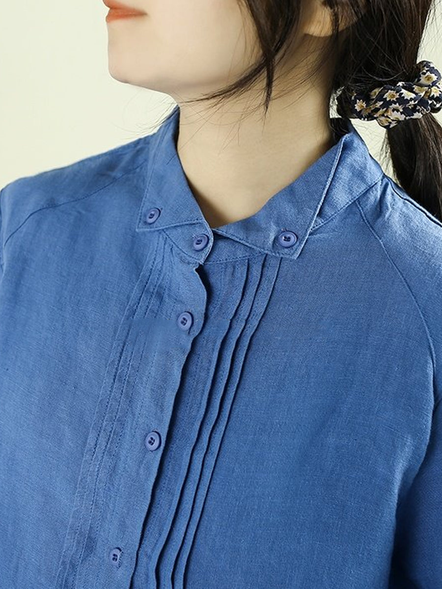 Women Artsy Spring Shirred Pure Color 100%Linen Shirt