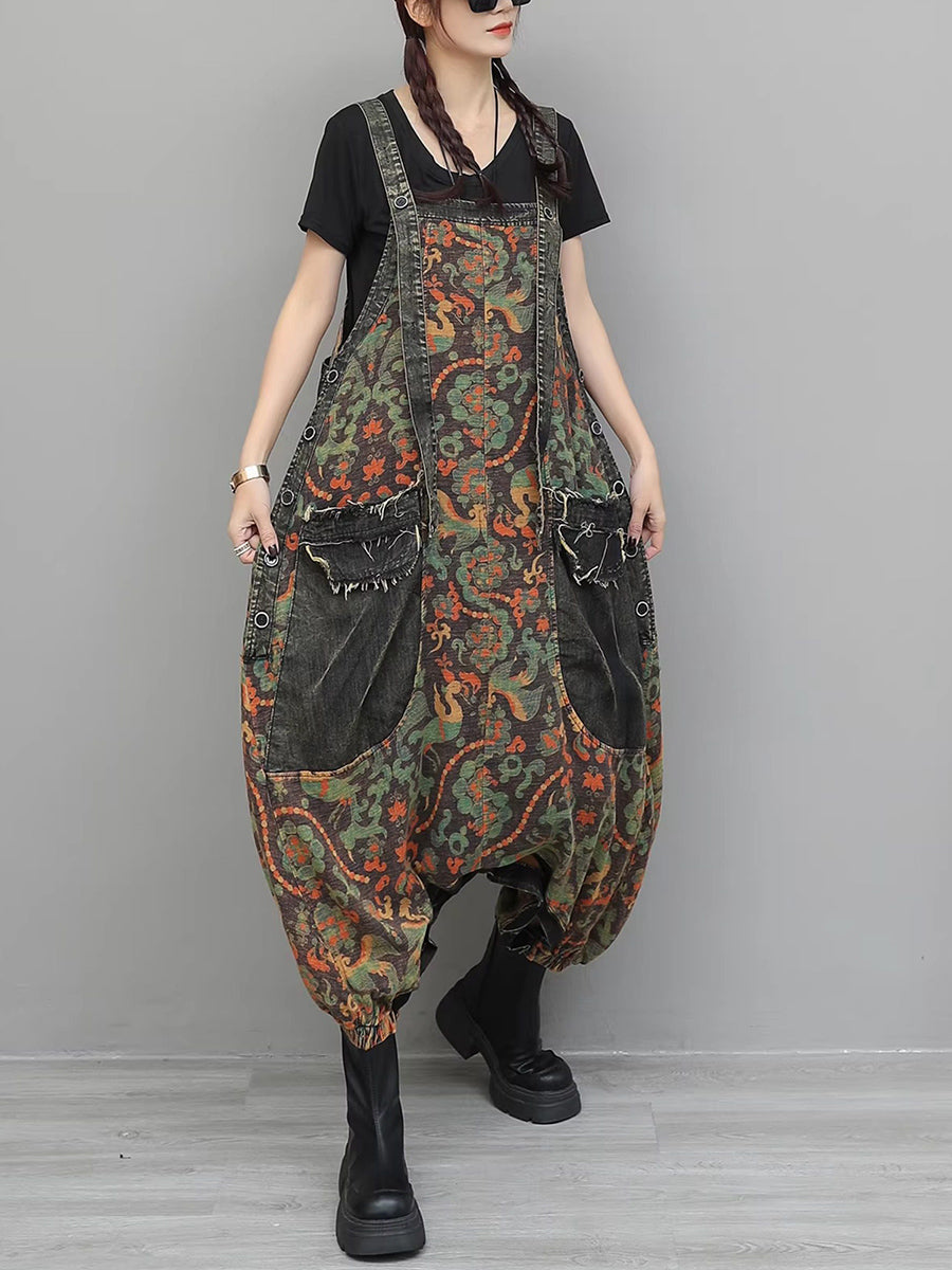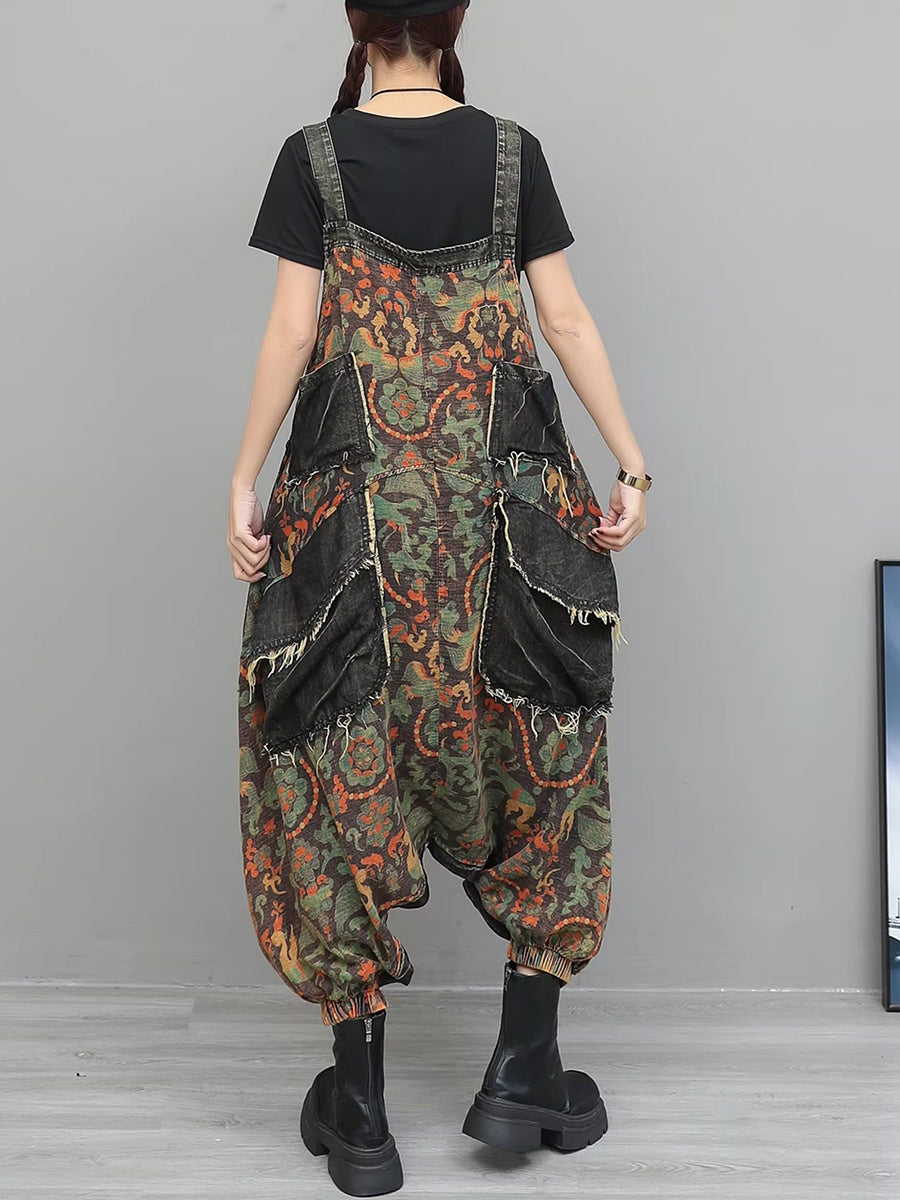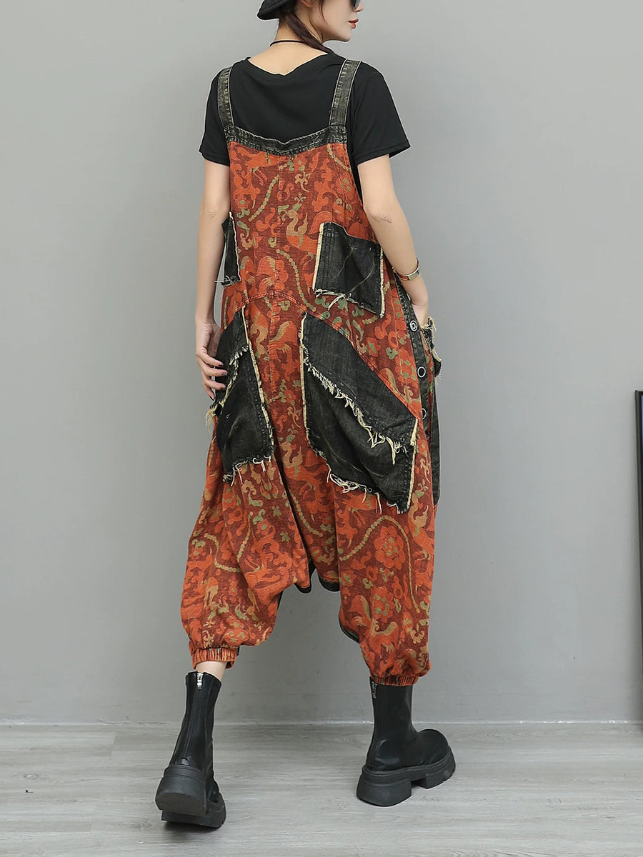 Women Vintage Flower Spliced Denim Jumpsuits