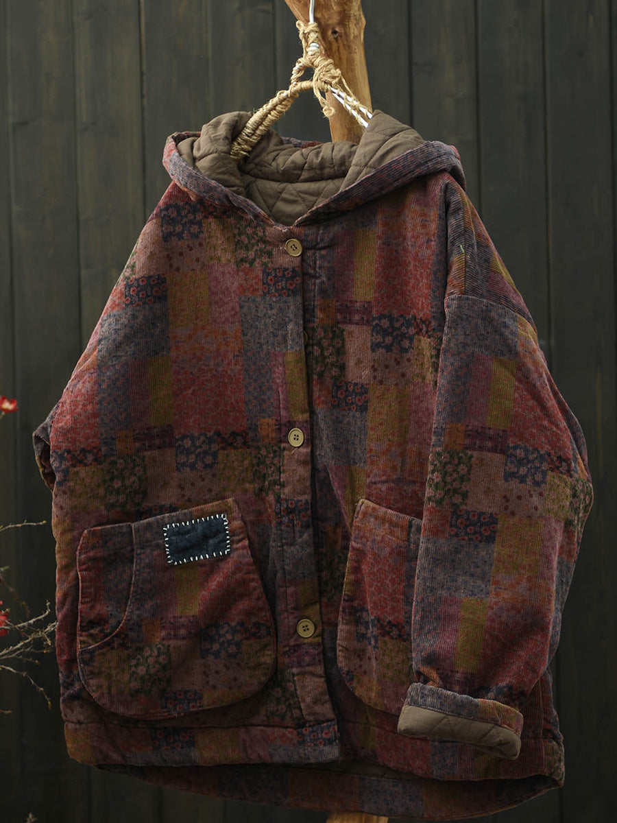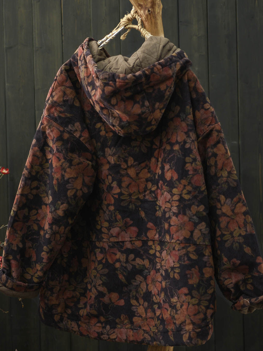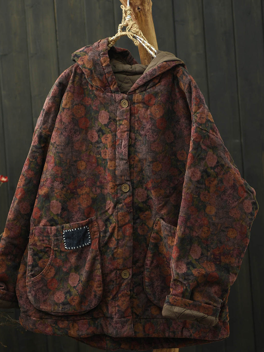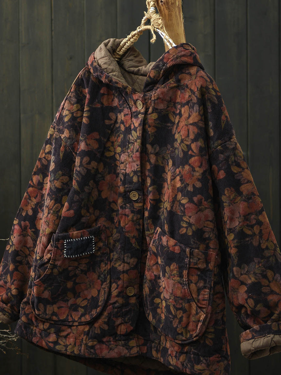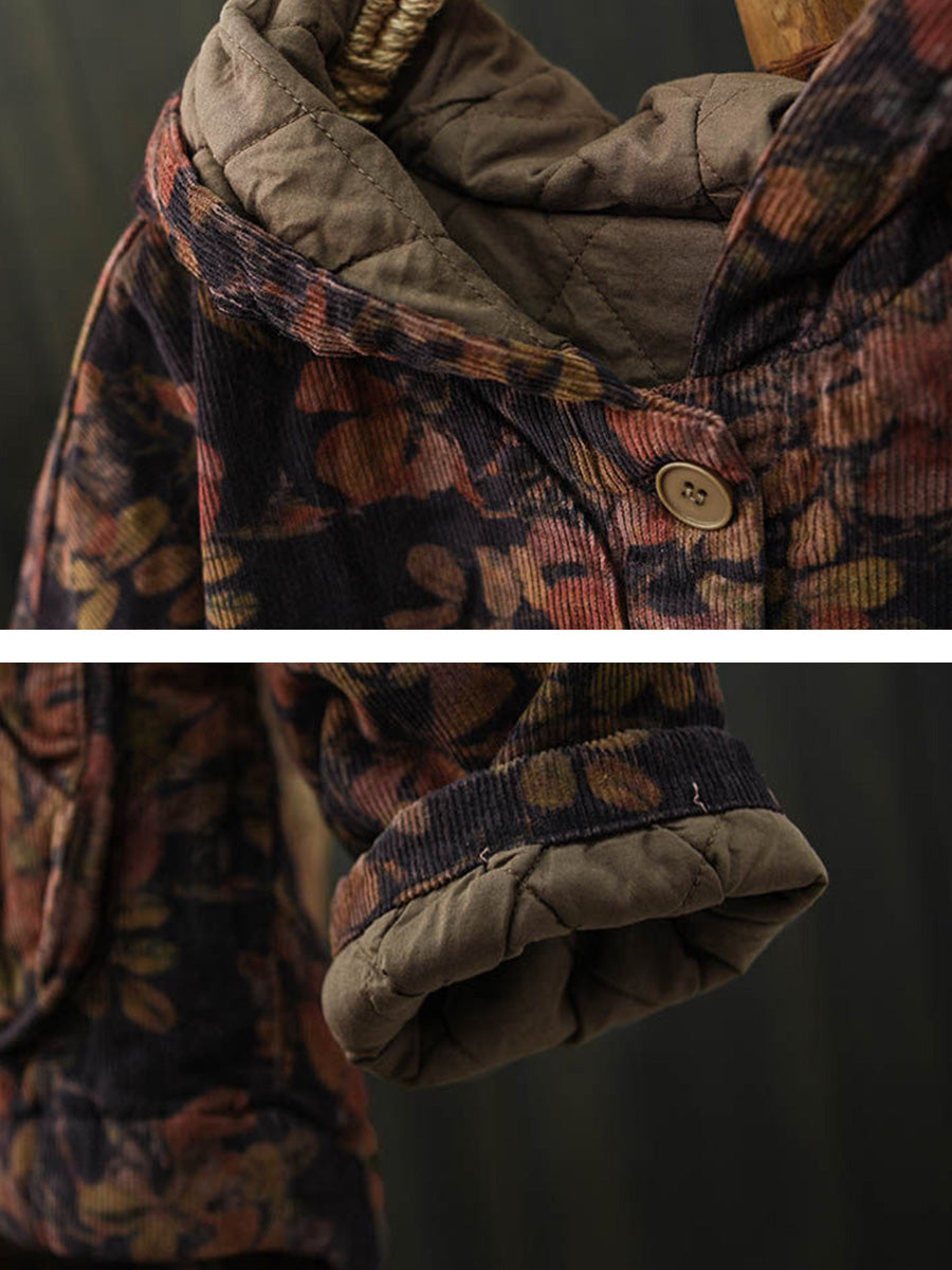 Women Winter Retro Flower Hooded Corduroy Padded Coat