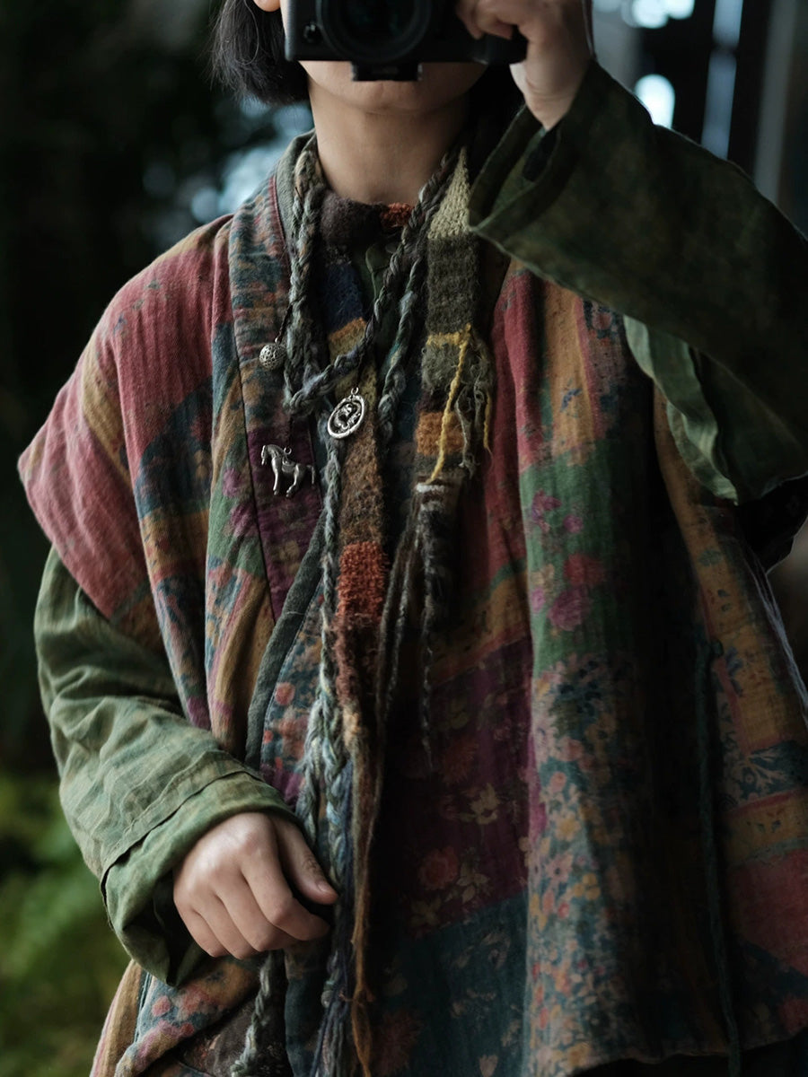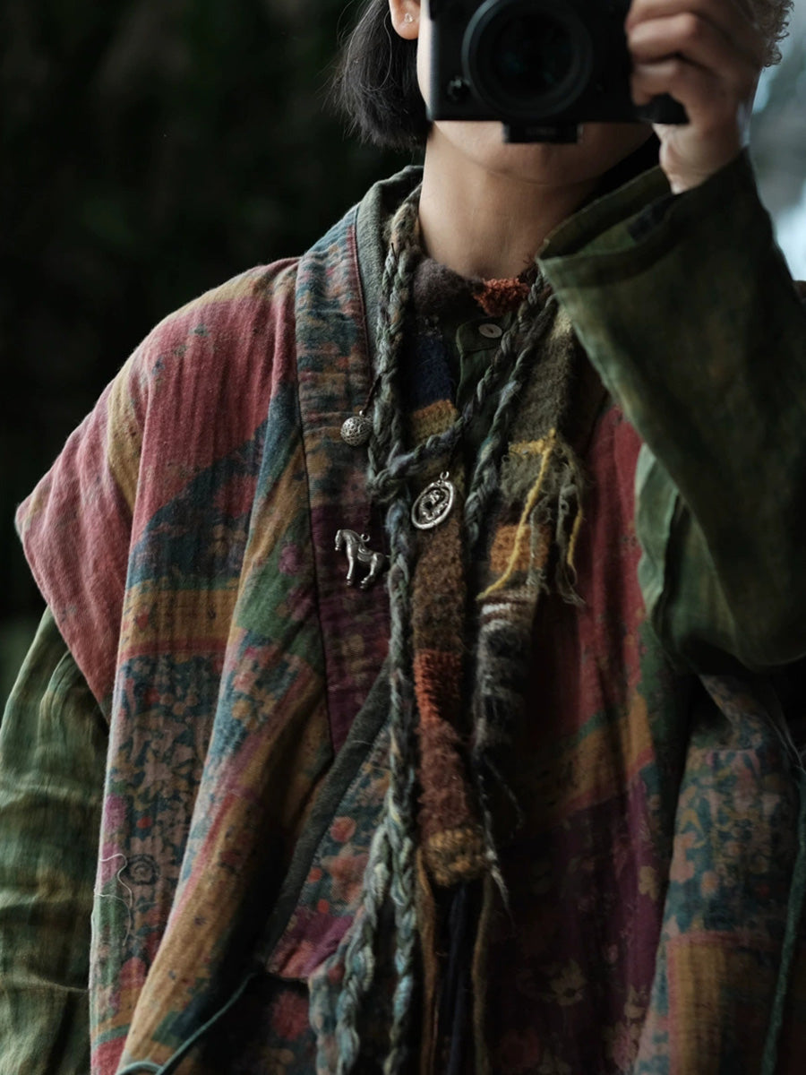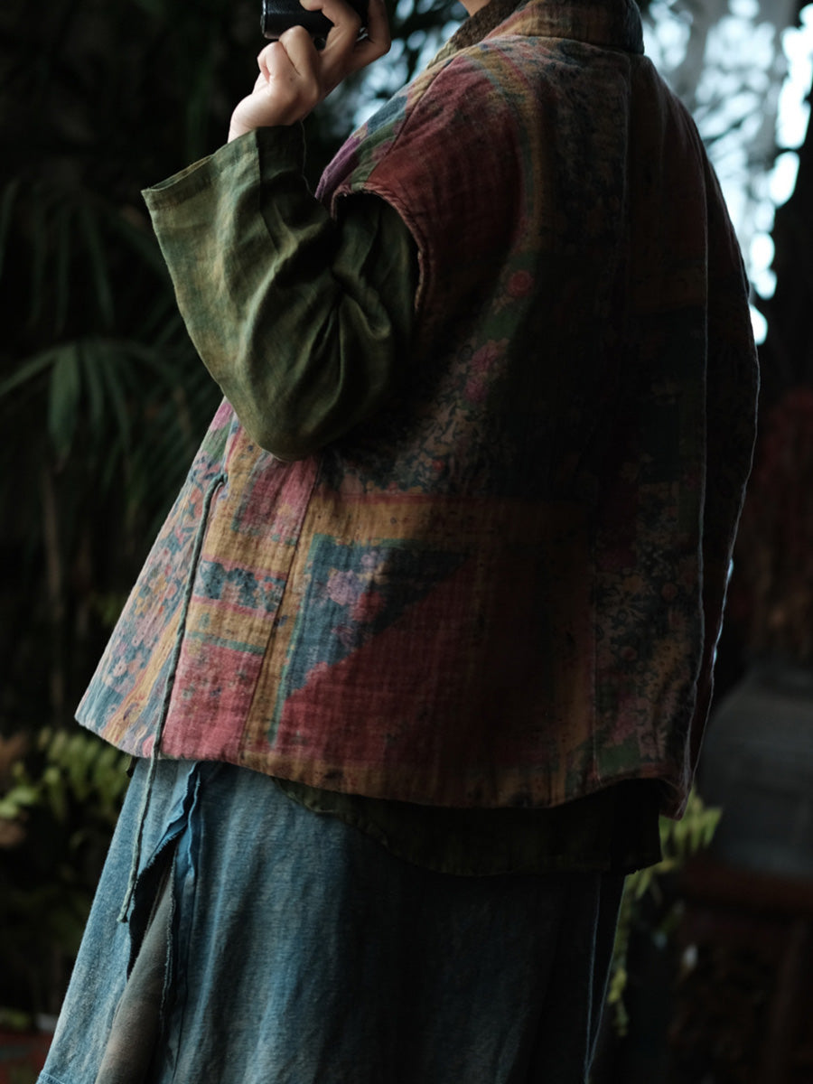 Women Winter Vintage Floral Spliced V-Neck Padded Vest