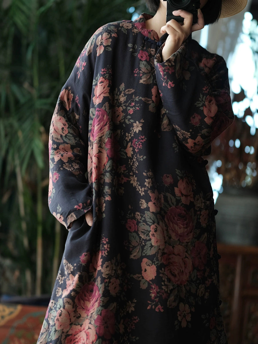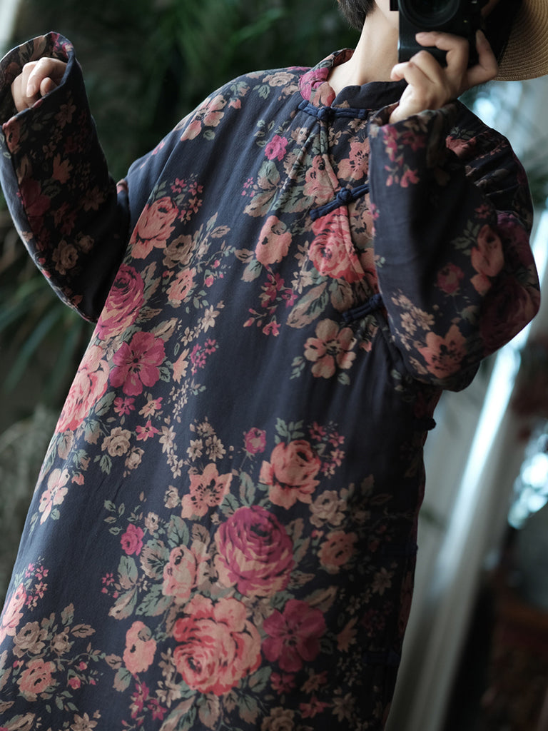 Women Winter Retro Flower Stand Collar Padded Robe Coat