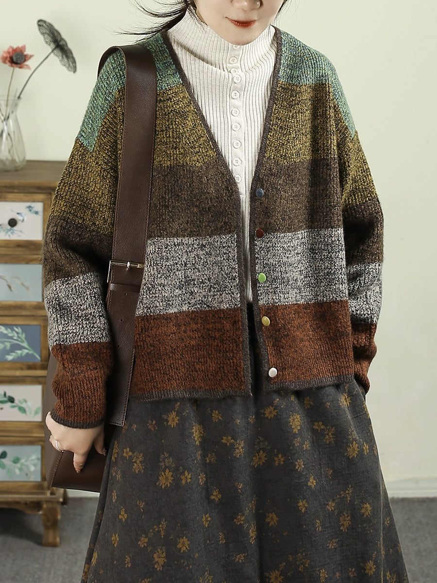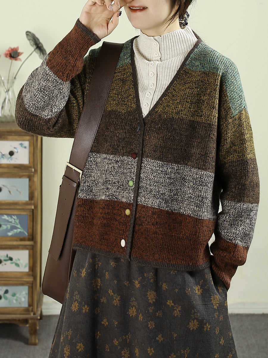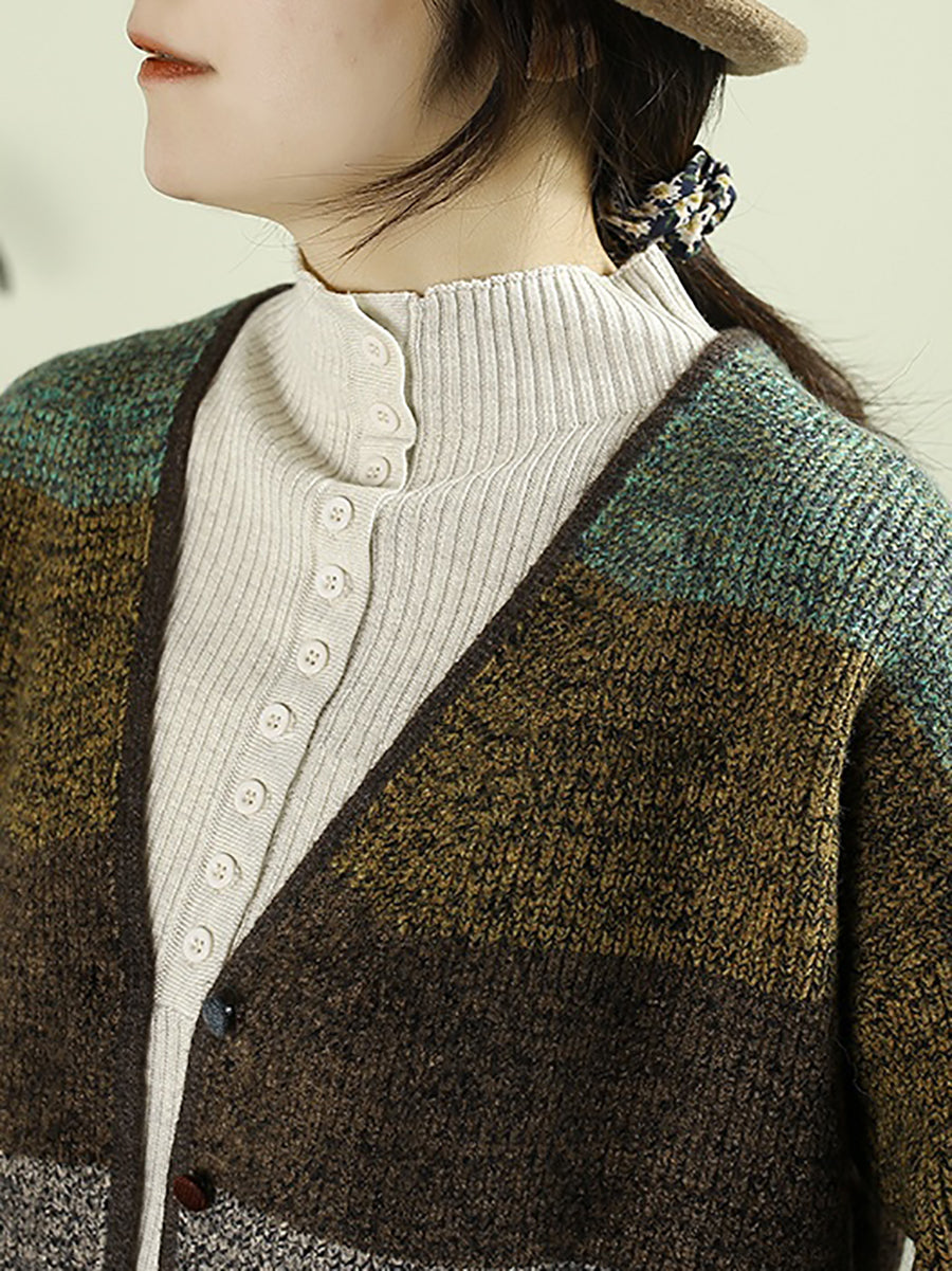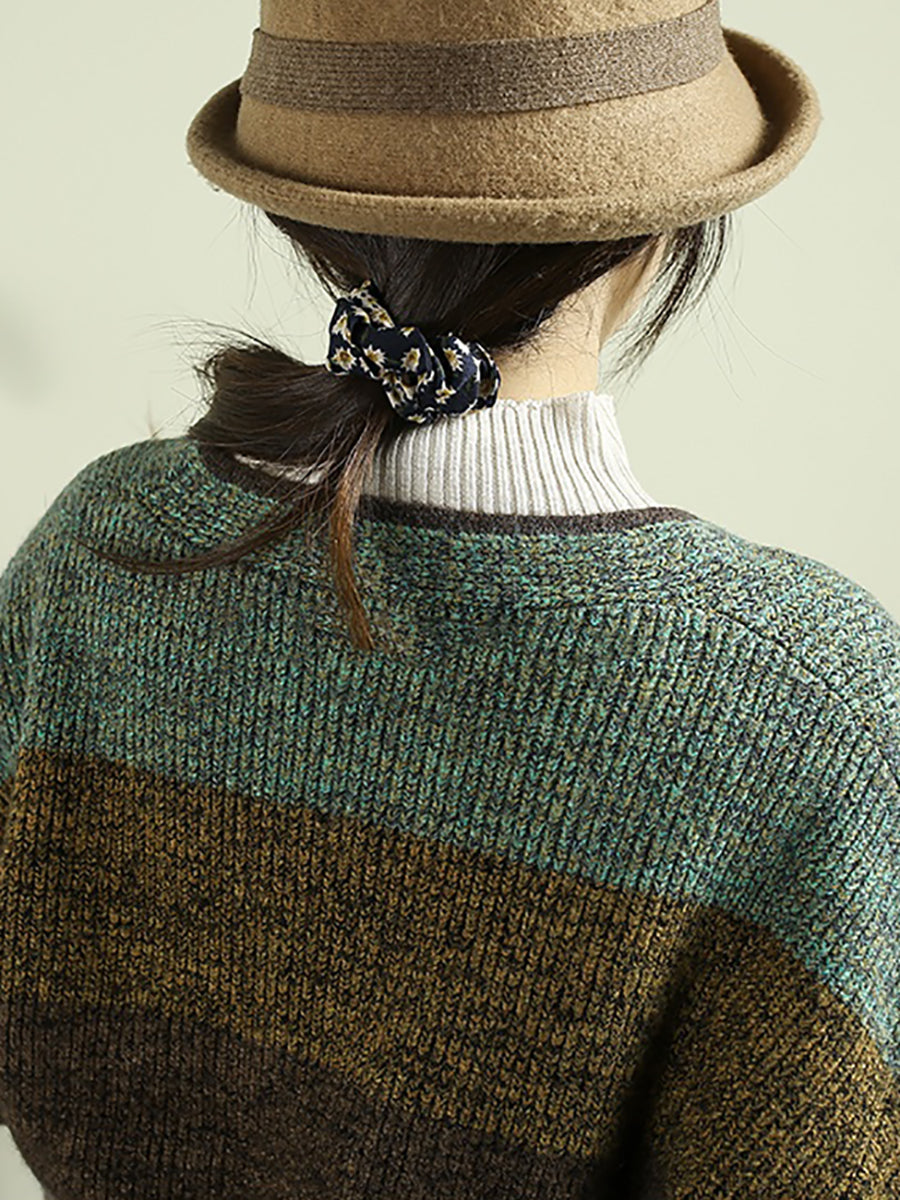 Women Autumn Colorblock Knitted V-Neck Sweater