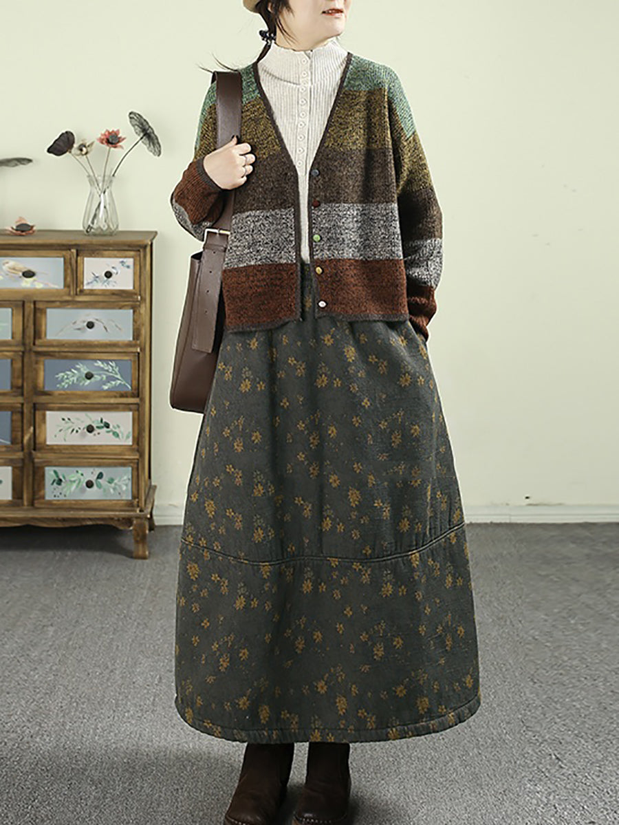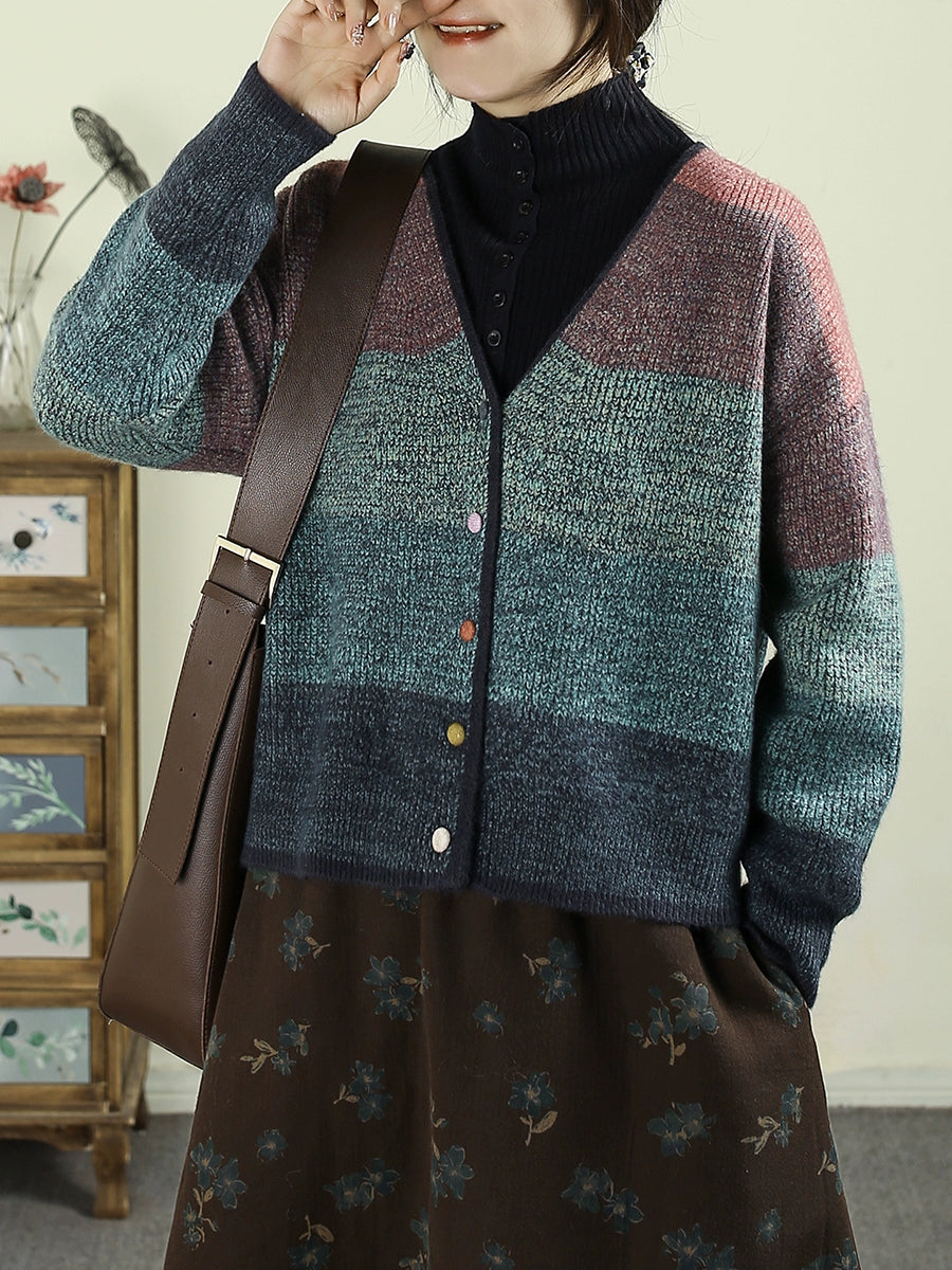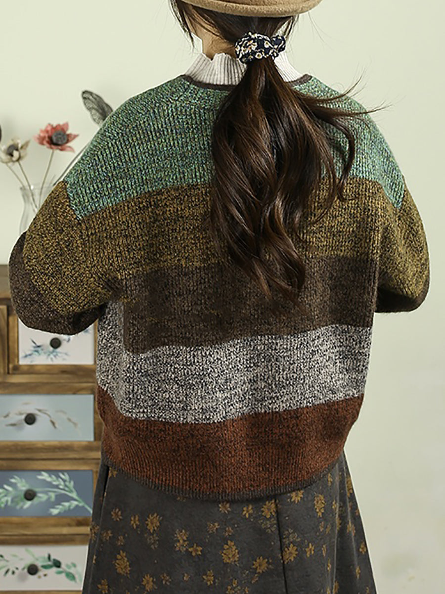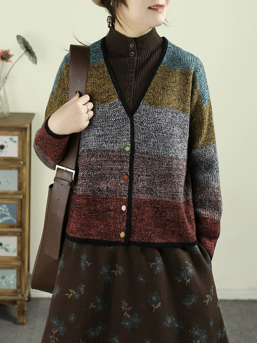 Women Autumn Colorblock Knitted V-Neck Sweater