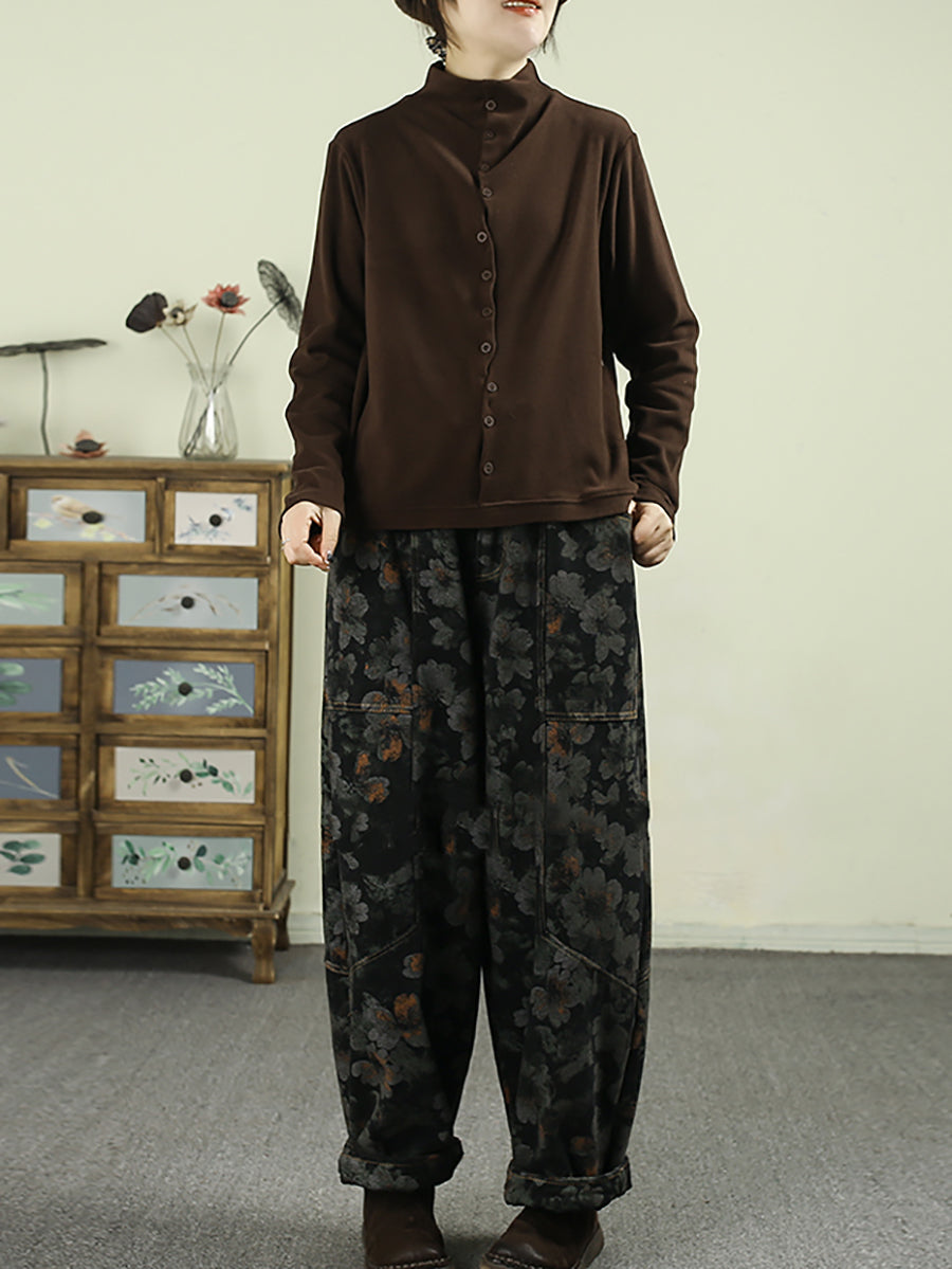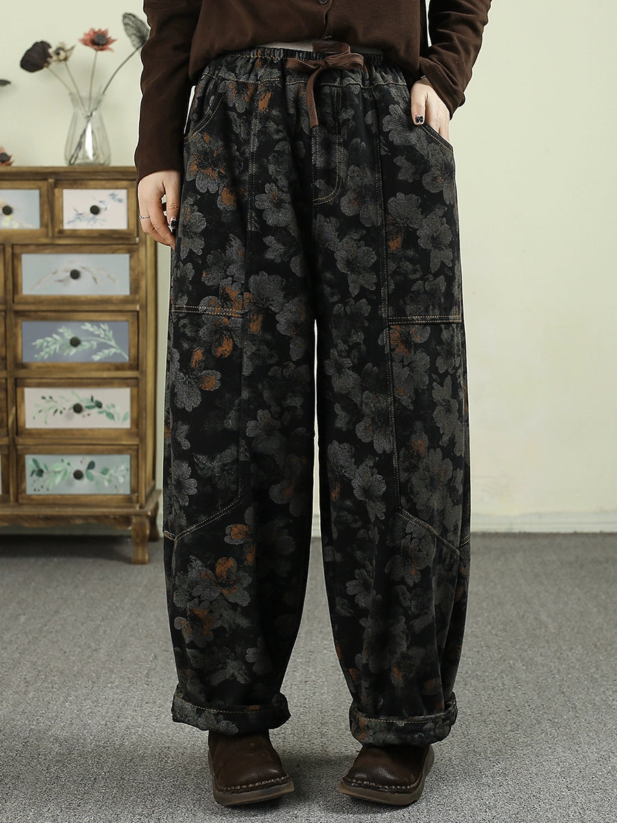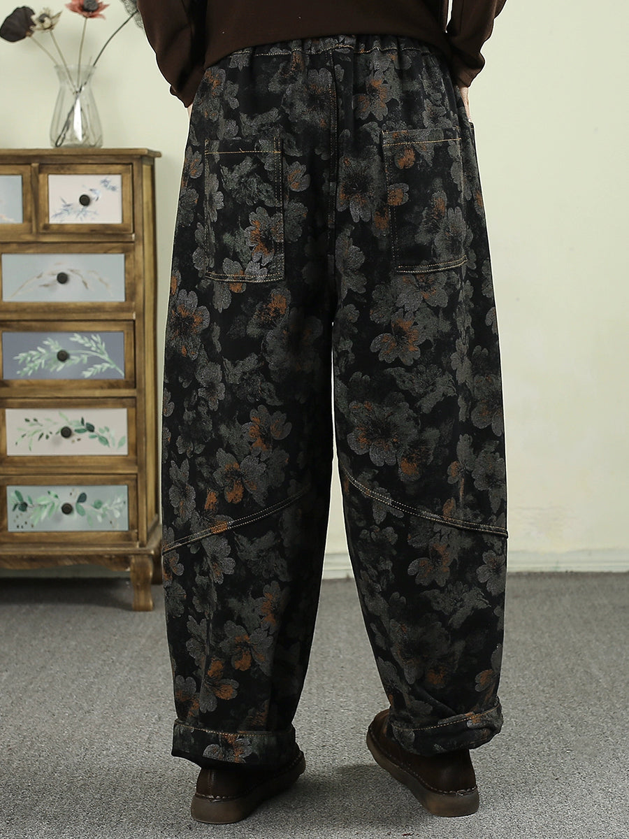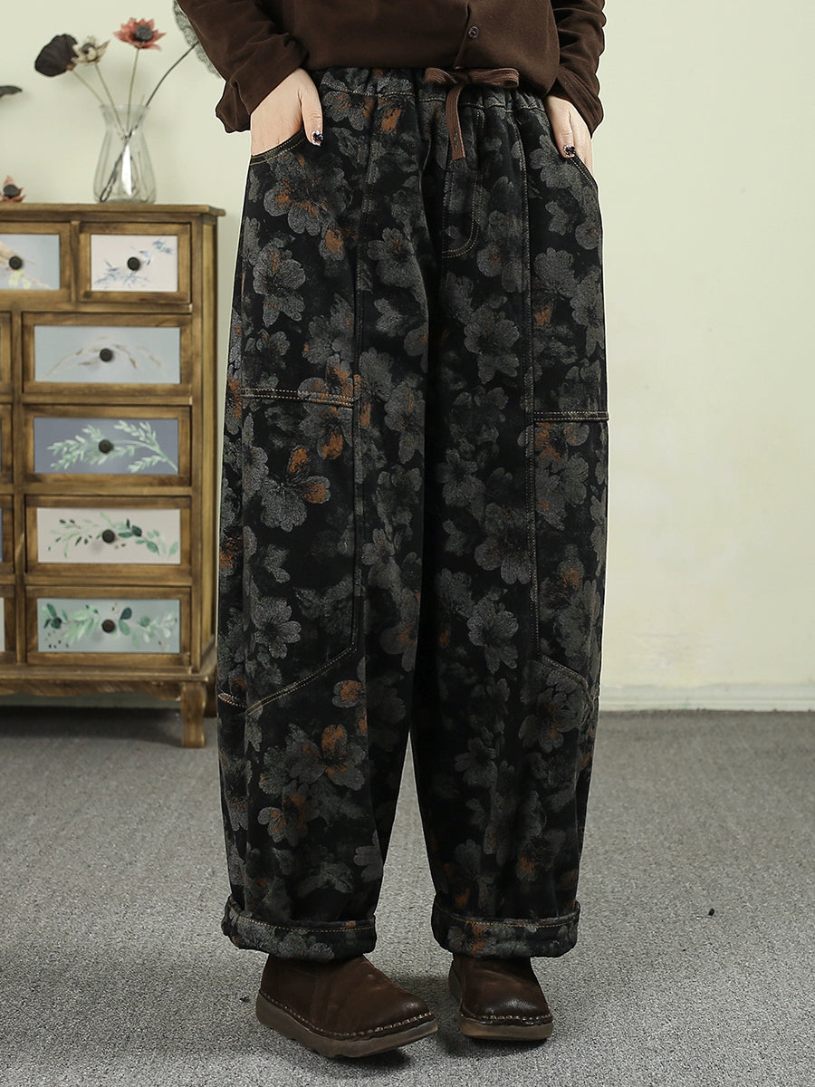 Women Winter Flower Denim Fleece-lined Harem Pants